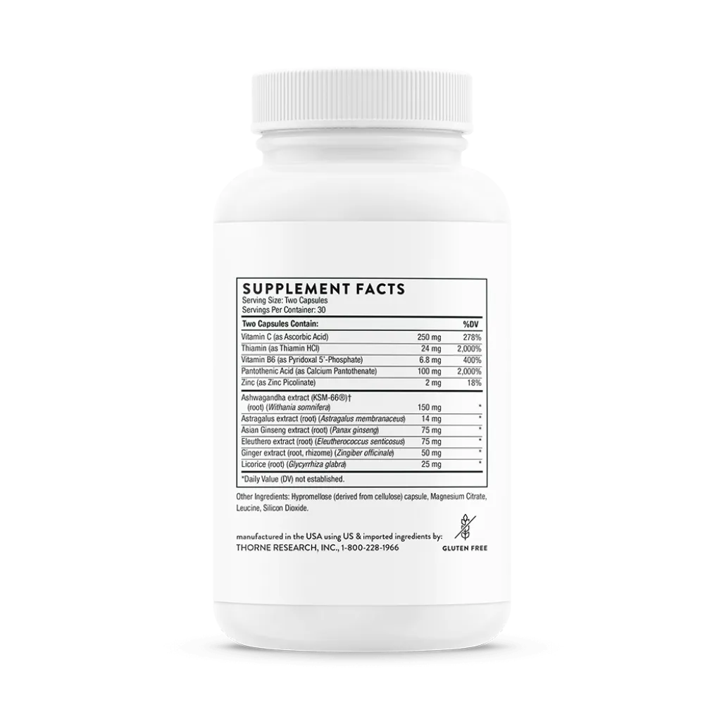 ByThorneAdrenal SupportPhytisone is a non-glandular formula of botanicals and nutrients to help optimize the adrenal gland's response to stress.* When humans encounter a threat, the adrenal glands release cortisol, epinephrine, norepinephrine, and other chemicals that raise our heart rate, blood pressure, and blood sugar, and constrict blood vessels to the digestive tract. This ""fight or flight"" reflex can be a life saver. However, the constant low-level stress most of us feel everyday, together with environmental pollution and diets that are high in refined carbohydrates, can overstimulate and overtax the adrenal glands, which can damage our immune, cardiovascular, neurological, and endocrine systems, and thus our long-term health. Phytisone provides botanical, non-glandular support for the adrenal glands. Its unique combination of key adaptogen botanicals and nutrients help the adrenals optimize their response to stress.* Astragalus membranaceus is used to promote energy production and support immune function.* Licorice root (Glycyrrhiza glabra) appears to have a modulating effect on cortisol activity.* Ginger (Zingiber officinale) has the capacity to increase the absorption of other substances.* Perhaps the two best-known adaptogens are Panax ginseng and Eleutherococcus senticosus. An abundance of research demonstrates an enhanced response to physical and chemical stress, as well as a beneficial physiological effect on the central nervous, cardiovascular, and endocrine systems, following administration of Panax ginseng.* Similarly, ample evidence supports the use of Eleutherococcus to help normalize the body's response to stress.* Ashwagandha (Withania somnifera) – often called Indian ginseng – is considered to be the preeminent adaptogen from Ayurvedic tradition.* Ascorbic acid, thiamine (vitamin B1), pantethine (the active form of vitamin B5), pyridoxal 5'-phosphate (the active form of vitamin B6), and zinc are included in Phytisone for their strengthening and supportive role in optimizing adrenal function.*