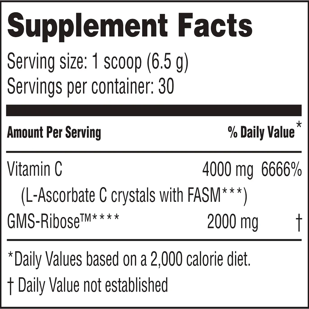 Vitality C is a pleasant tasting, non-acidic, high potency Vitamin C powder enhanced with a GMS Ribose Complex. It contains 4 grams (4000mg) of Vitamin C per teaspoon that can be taken without stomach upset, gas or diarrhea that usually comes with high doses of Vitamin C. American Nutriceuticals' Vitality C utilizes four unique uptake pathways for superior absorption:
