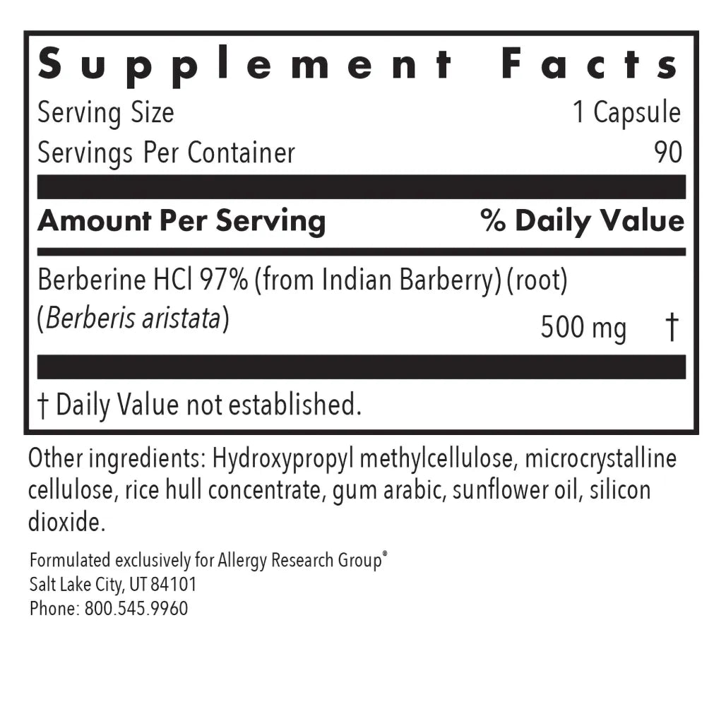 Pure, highly concentrated berberine HCl (97%), from non-GMO Indian barberry. Berberine supports healthy cholesterol and blood sugar within normal levels, and a normal balance of microbes in the respiratory and GI tracts.