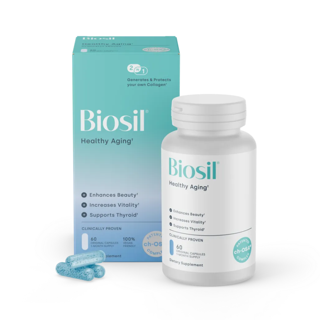 ch-OSA®, our patented and uniquely effective complex, and Selenium are the two active ingredients in Biosil® Healthy Aging. The other ingredients are microcrystalline cellulose, purified water. Capsule shell consists of hypromellose and spirulina.Biosil® Healthy Aging is vegan and GMO-free. It does not contain soy, dairy, egg, corn, wheat, gluten, fish/shellfish, peanuts/nuts/tree nuts, animal-derived ingredients, ingredients from genetically modified organisms, artificial colors, artificial preservatives, or any flavors or sweeteners.