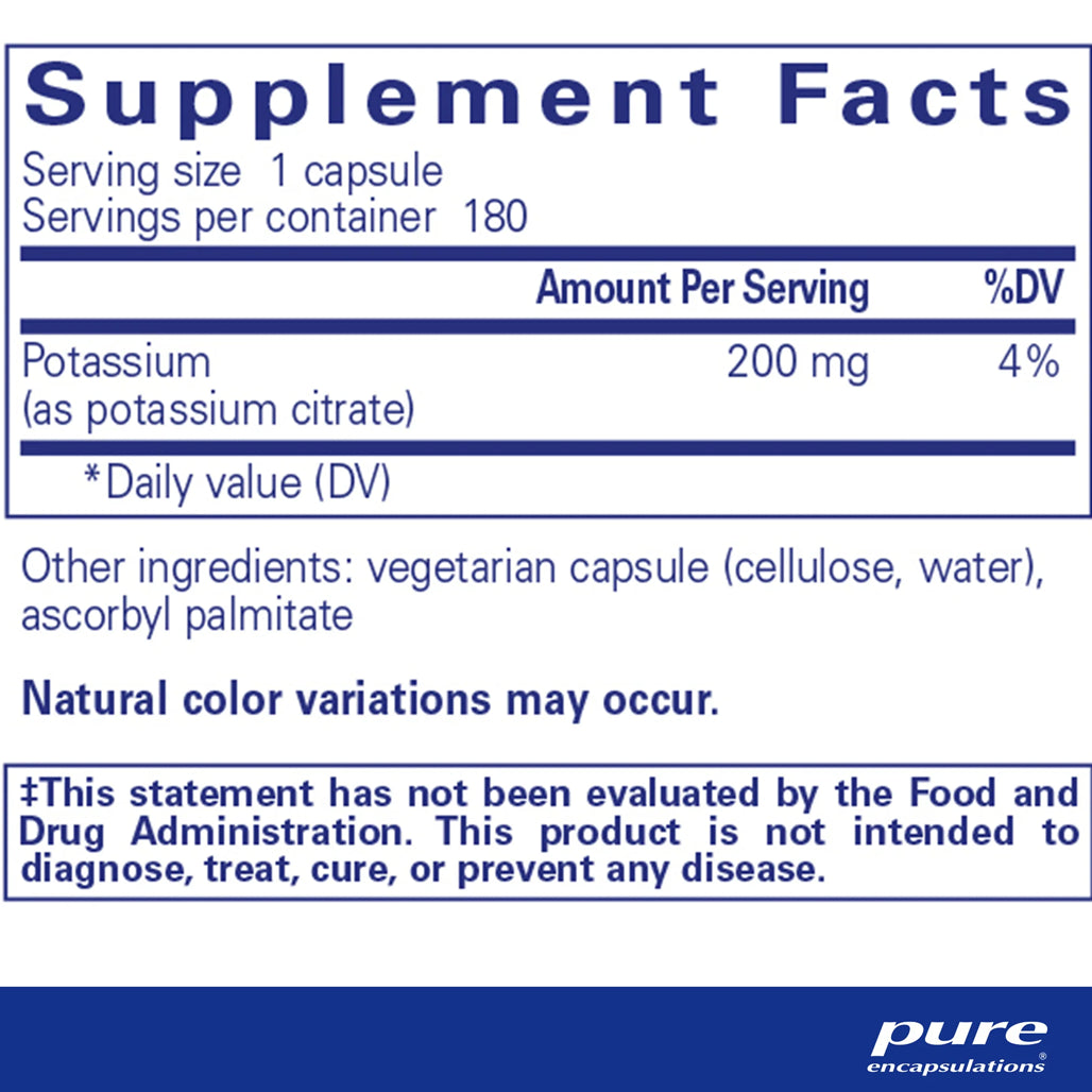 Potassium is a mineral found in many foods, including vegetables and fruits, that helps to keep your body functioning at its optimal level. Potassium is essential for heart health, muscle contraction, and gastric secretions. Pure Encapsulations offer potassium in citrate form to support various physiological enzymatic processes in the body.