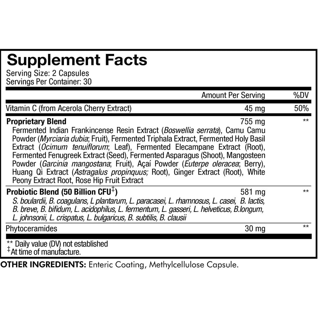 Codeage Skin Probiotic supplement offers an all-in-one premium probiotic supplement specifically formulated to support your skin. This advanced formula features 19 strains of probiotics with 50 Billion CFUs* per serving to help provide a convenient source of good microorganisms in an easy-to-use capsule format. This probiotics and prebiotics formula features botanical herbs rooted in Ayurveda. The advanced prebiotic and probiotic formula features a botanical blend including açai powder, ginger and rosehip extracts, triphala, fenugreek, and provides 30 mg of phytoceramides per serving. This probiotic dietary supplement is shelf-stable and doesn’t require refrigeration. Simply take 2 capsules once daily morning or night with or without food alongside a glass of water to enjoy these shelf-stable skin probiotic pills. Codeage skin probiotics formula supplement is vegan and non-GMO. This beauty supplement for men and women is also gluten, dairy, soy, milk, egg, wheat, shellfish, additives, and preservatives free. The probiotics capsules are manufactured in the USA in a cGMP-certified facility and third-party tested.