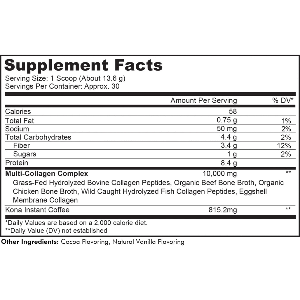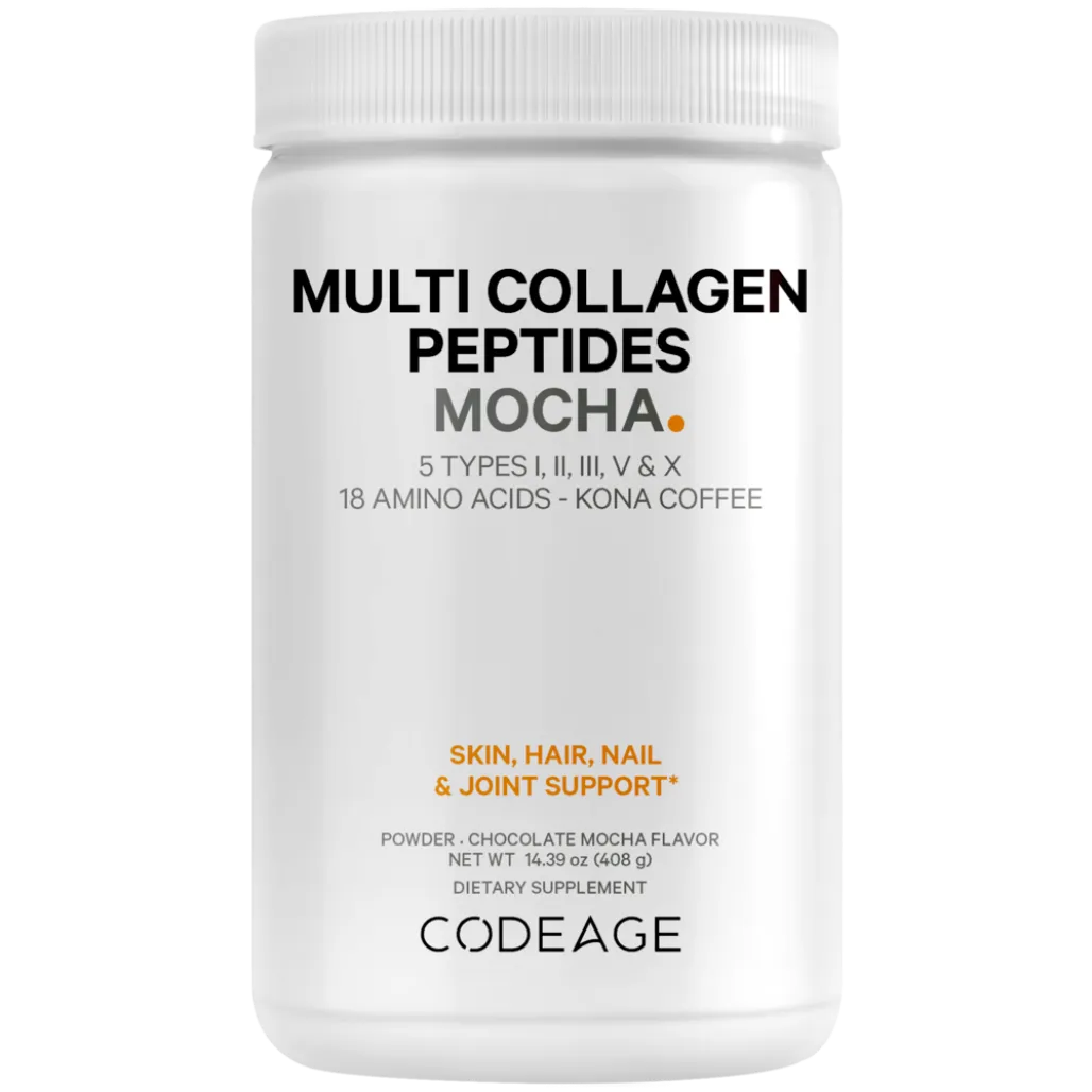 Codeage Multi Collagen Peptides Mocha features a gourmet Kona coffee blend with five types of collagen—types I, II, III, V, and X—from five distinct sources. This delicious moch...