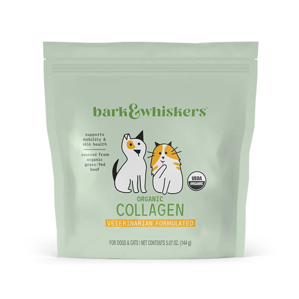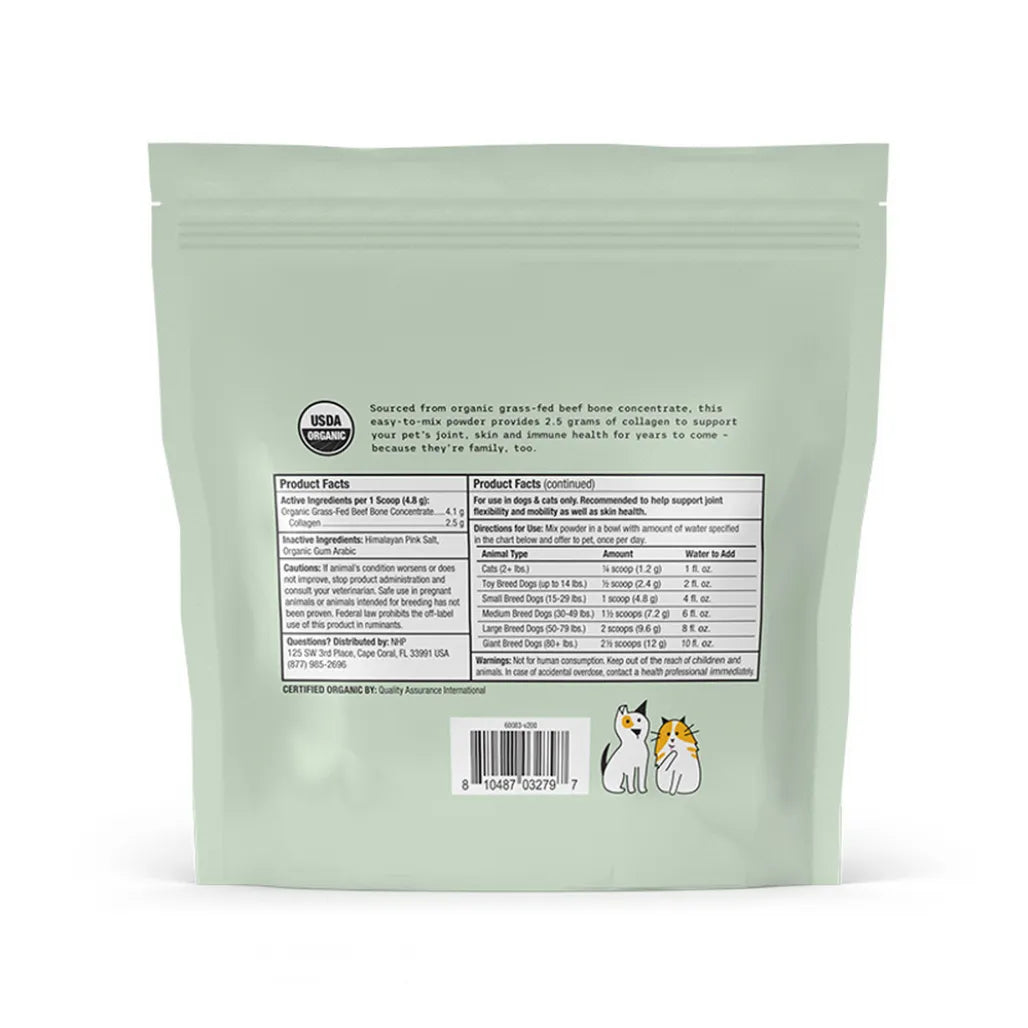Collagen is the most plentiful protein in your pet’s body – it makes up as much as 30% of his or her body’s total proteins and 70 to 80% of the protein in skin. Found in the connective tissue throughout the body, collagen provides the structural scaffolding for tissues to maintain their integrity and flexibility. Collagen supports the integrity of your pet’s muscles, bones, tendons, ligaments, blood vessels, digestive tract and skin. It plays an essential role in many functions: • Supports digestion by increasing stomach acid and attracting and holding liquids, including digestive juices in your pet’s gut • Helps restore and maintain gut health, as well as support immune function • Supports normal detoxification processes as a precursor amino acid for glutathione • Supports healthy muscles and energy production during exercise by forming creatine along with two other amino acids • Supports the genetic building blocks, DNA and RNA, for healthy cells • Supports your pet’s normal healthy inflammatory response As vital as collagen may be to your cat’s or dog’s well-being, her body’s capacity to produce it declines as she ages. Lost collagen can be replaced, however. The sooner you begin supplying your pet with the building blocks his body needs, the more likely you can help support healthy, comfortable movement and all of collagen’s other potential benefits. Dr. Mercola Organic Collagen Powder is unique for several reasons. It’s... • Sourced from Organic Grass Fed Beef Bone Concentrate and not a by-product of the leather industry. • USDA Certified Organic so you know exactly what you’re getting. • Third-party tested for heavy metals so you can serve it to your pet with confidence. • Not processed with metal salts as it’s a minimally processed “complete” source of collagen. • Created especially for cats and dogs so it’s free of additives, flavorings, added sugar, onion, spices and MSG. • Very palatable thanks to a dash of Himalayan salt, making it a great option for increasing your pet’s fluid intake