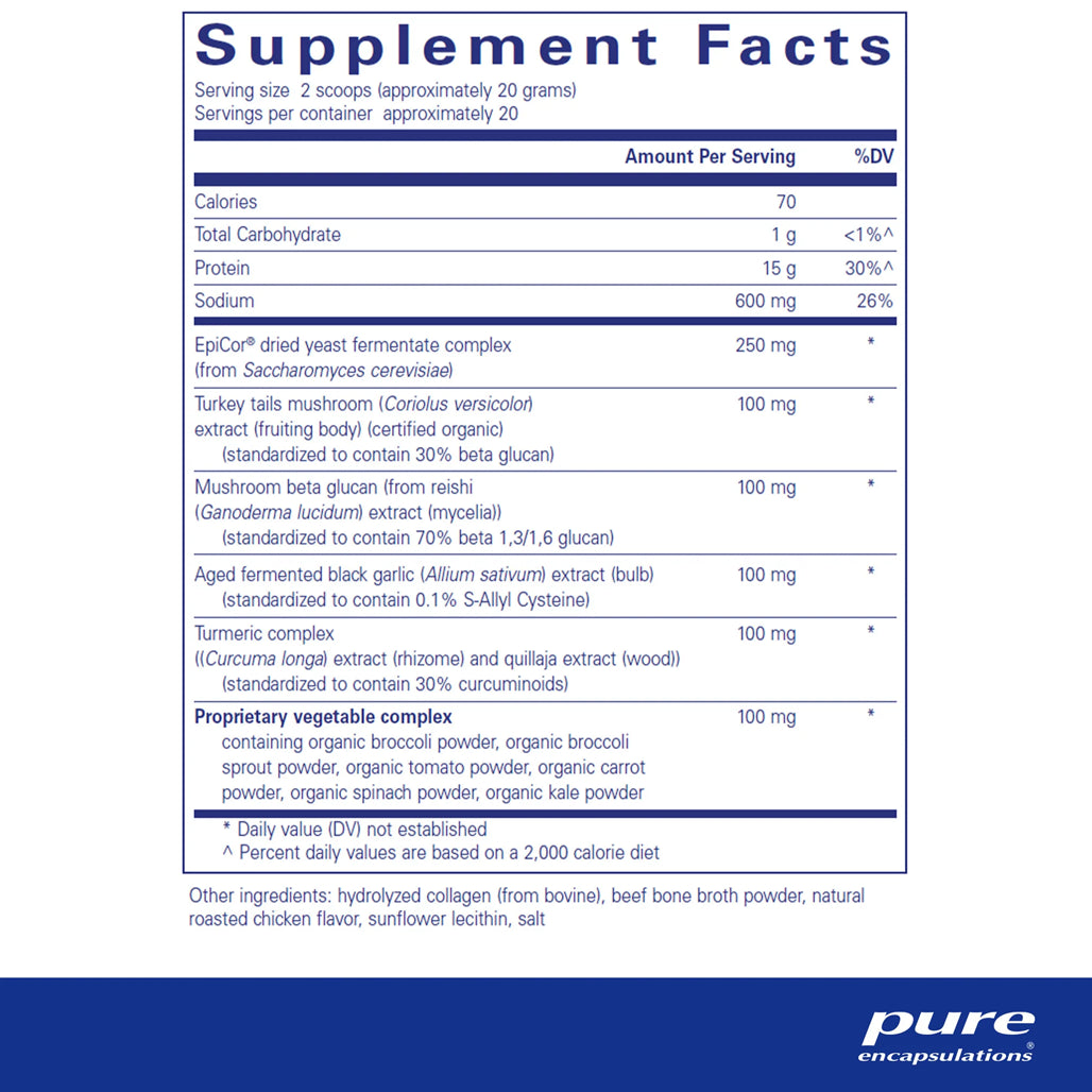 Savory bone broth and hydrolyzed collagen powder with immune-supportive mushroom, aged garlic, and enhanced bioavailability curcumin extracts*