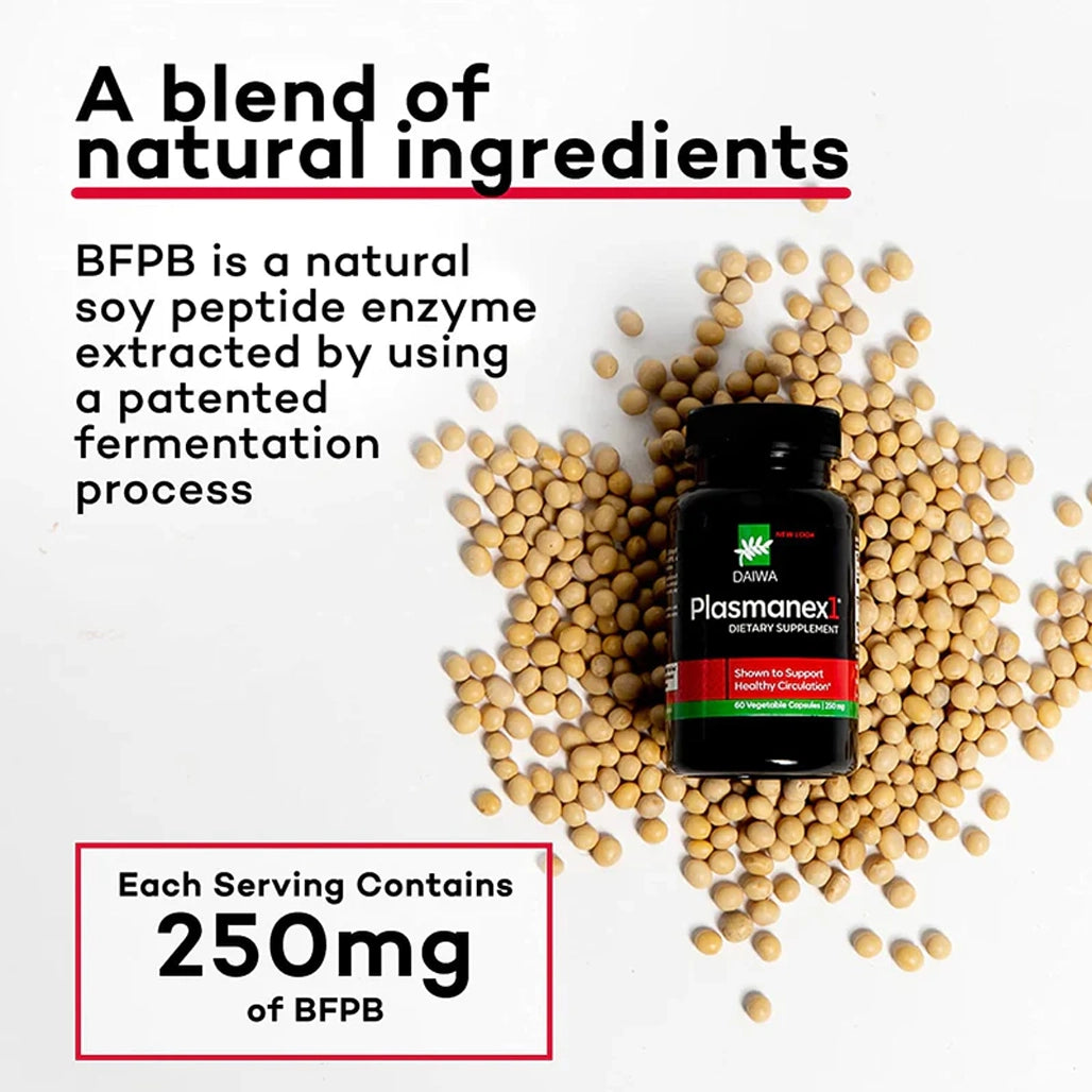 The active ingredient in Plasmanex 1 ® is Bacillopeptidase F Proprietary Blend (BFPB). BFPB is an innovative blend of natural ingredients. The complex contains Bacillopeptidase F, a natural soy peptide enzyme extracted by using a patented fermentation process, (Patent No JP3532503). The enzyme is isolated from natto to form a unique molecule shown in scientic research to support healthy blood circulation.* Why is Plasmanex 1 superior to Nattokinase? Nattokinase is a fibrinolytic protease, which by nature is an enzyme whose basic function is to hydrolyze proteins. Proteins can be broken down to either peptides or peptides and amino acids to make them absorbable. They may also facilitate reduction of plaque formation, but there are no credible clinical trials backing that function. Plasmanex 1 is an NKCP compound that has a multitude of functions, formed by a secret formulation using a fermentation process markedly different from Nattokinase predominantly in the type of bacteria used as well as type of solution. Organisms used are “Halotolerant” that is they survive in mild salt solutions, which would normally kill the bacteria used for the production of Nattokinase. Halotolerant bacterial concept (used in Plasmanex 1) also leads to a markedly more potent enzyme that has a broader functional capability. Thus the change in bacteria as well as the basic solution make them entirely different products. With markedly higher potency for Plasmanex 1, Nattokinase predominantly effects fibrinogen function, while Plasmanex 1 supports normal PAI-1 levels supporting normal coagulation. Plasminogen Activator Inhibitor -1 (PAI-1) is a protein, which when elevated can increase the risk of thrombosis and atherosclerosis. What Benefits can Plasmanex 1 deliver? Scientic research has shown that BFPB in Plasmanex 1 can: • Support healthy blood circulation* • Reduce the cold and numbing in extremities, especially important in winter months • Support normal blood circulation by sustaining a balance between blood clot formation and blood clot dissolution* • Support healthy blood flow during prolonged travel, and occupations requiring standing for long periods of time* • Promote optimal heart health*