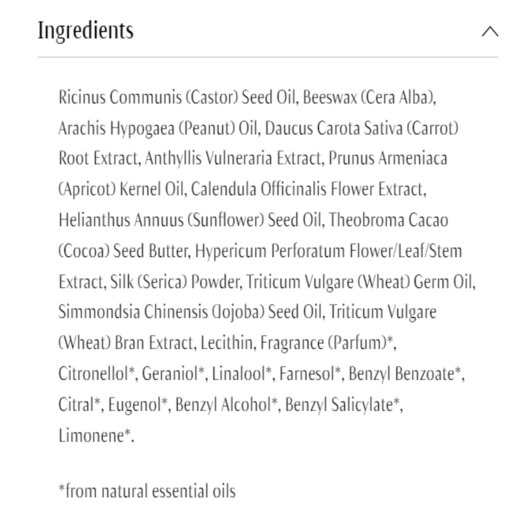 Lip Balm offers intensive, soothing care for dry, chapped lips. This rich balm supports skin renewal and helps smooth fine lines and wrinkles while helping to moisturize, soften and provide a translucent shine. Formulation: Pure silk powder with extracts of carrot, anthyllis, calendula and St. John's wort help soothe and fortify lips. Nurturing jojoba and apricot kernel oils helps soften and renew lips. Beeswax and cocoa butter help protect and soothe chapped lips.