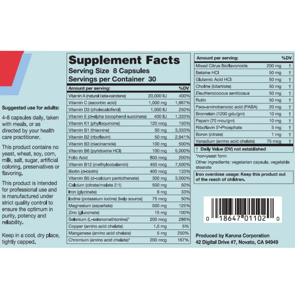 MAXXUM 2 contains iron and is ideal as a maintenance multi for individuals at risk of iron deficiency, including menstruating women. The unique MAXXUM 2 formulation includes practitioner-requested ingredients including digestive support from HCl and enzymes. Capsules are often preferred for their smaller size and quick dissolution. The formulation of this very popular supplement has been left in its original form at the request of health care professionals whose patients have used it with confidence over the years.