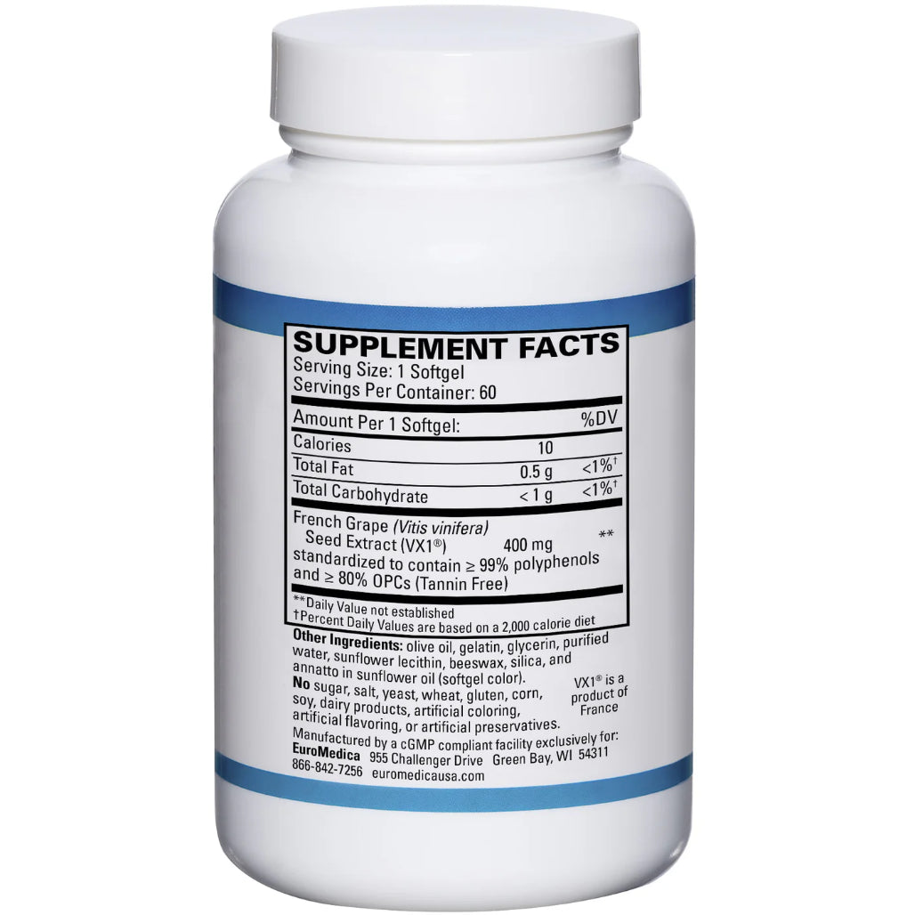 Oligomeric proanthocyanidins (OPCs) are the scientifically proven health promoting nutrients in grape seed extract.* French grape seed extract VX1® is standardized to contain l...