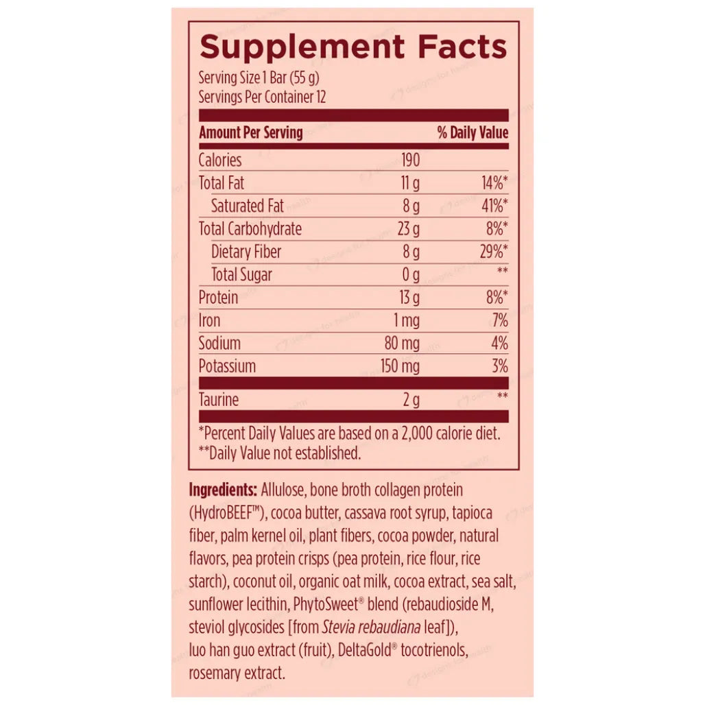 A delicious functional supplement bar that boasts a chocolatey oat milk coating, and a crunchy hot-cocoa flavored protein filling boosted with the amino acid taurine. The protein blend uniquely combines grass-fed, hydrolyzed bone broth protein (as HydroBEEF™) and pea protein crisps to create a comprehensive and complementary amino acid profile.