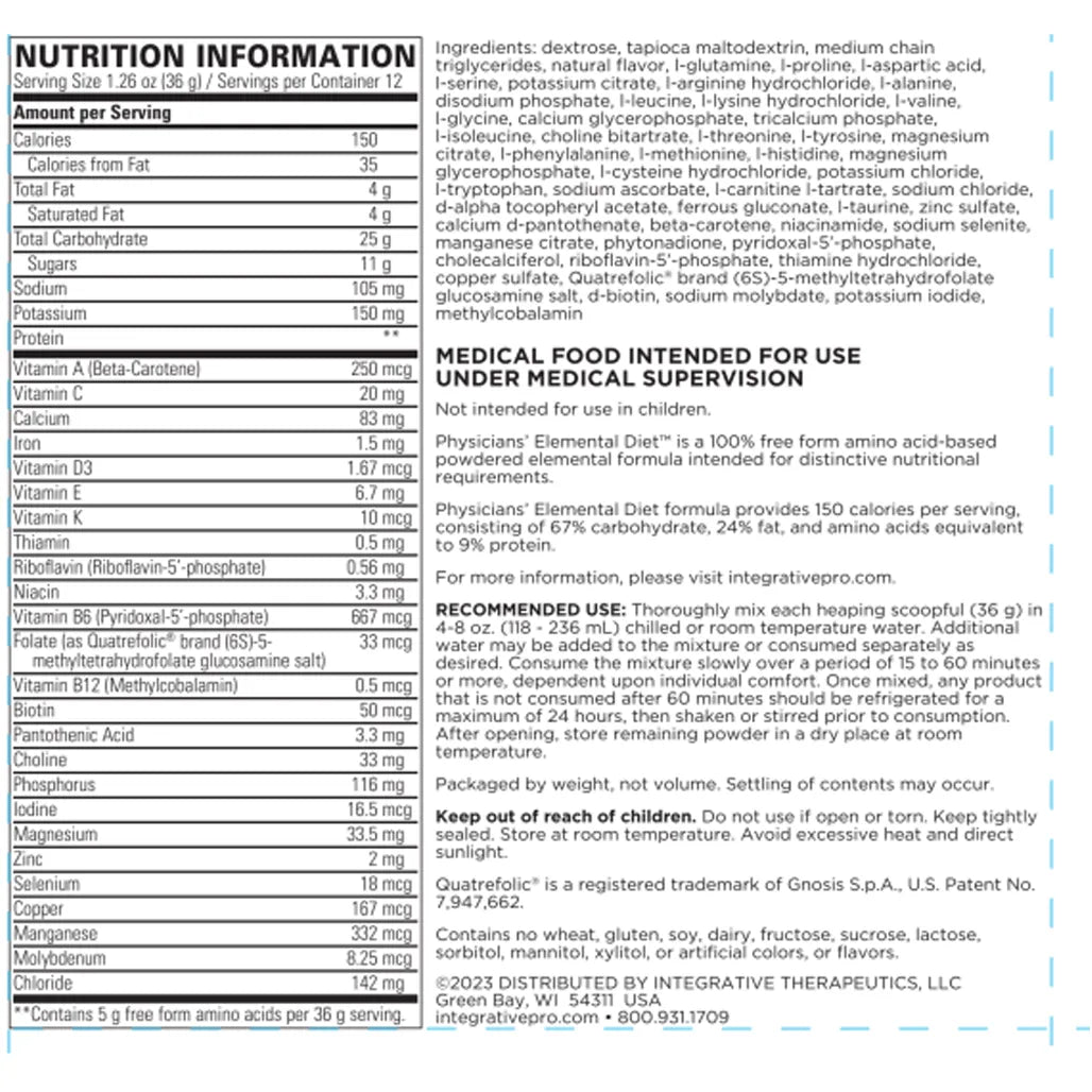 Integrative Therapeutics Physicians Elemental Diet powder is used by people suffering from gastrointestinal issues like IBS, IBD, Crohn’s disease or SIBO. In these conditions, individuals often experience significant discomfort after eating a meal. The body's ability to digest food or absorb nutrients is compromised, and using an elemental diet powder fulfils the nutritional needs. It is one of the most recommended best elemental diet powder.