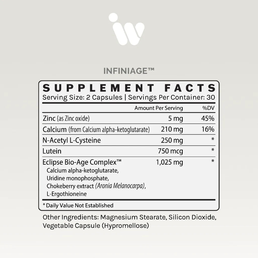 Based on that information, InfiniAge™ was born. It contains a precise blend of 7 key ingredients, including Calcium Alpha-Ketoglutarate, Uridine Monophosphate, Ergothionine, N-Acetyl L-Cysteine, Lutein (Carotene-2,2,-diol) Aronia Melanocarpa Extract, and Zinc. Many of these ingredients have vast publications which describe a multitude of benefits with regard to the aging process. We have also included what could be considered novel ingredients, relative to longevity, into this formulation as well. Each of these has been specifically identified in the OMICm Age algorithm which can beneficially impact OMICm Age factors.