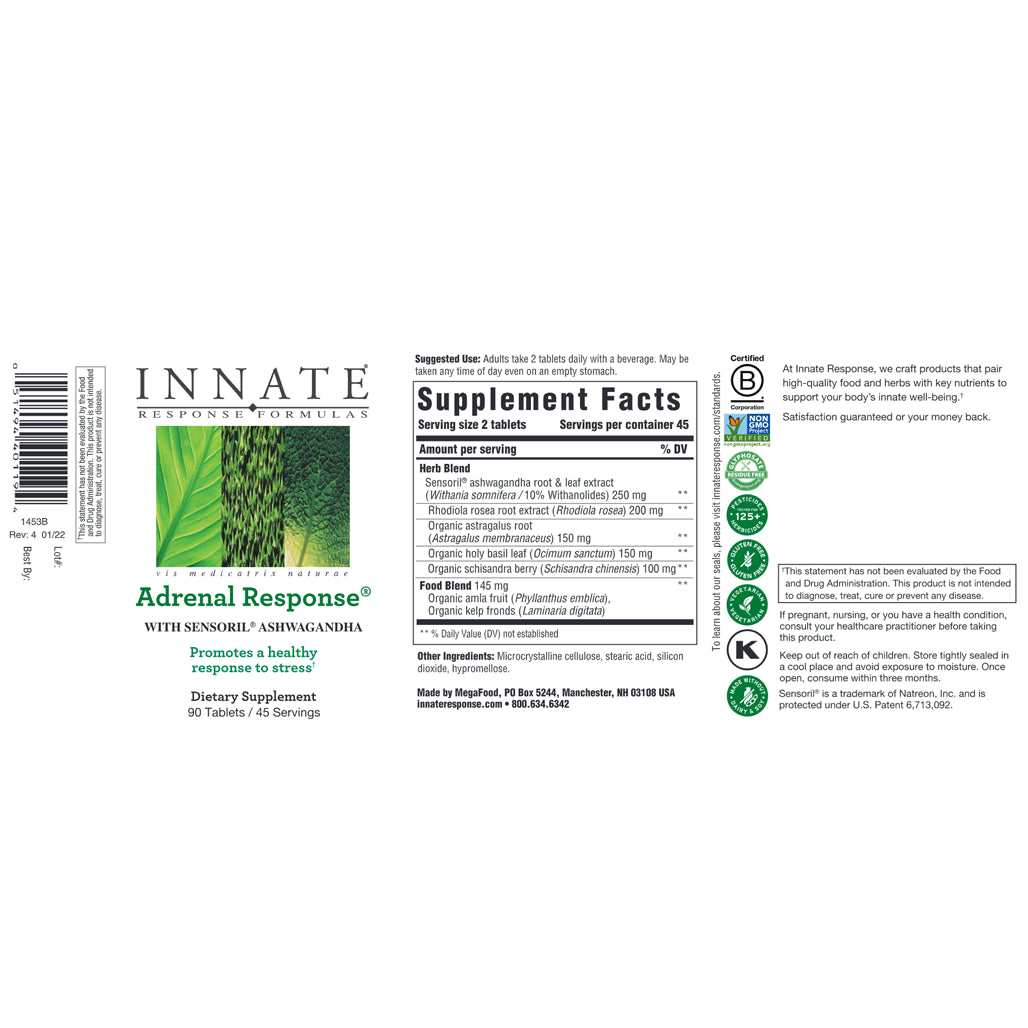 Adrenal Response with Sensoril Ashwagandha - 90 Tablets by Innate Response | Supplement for stress management
