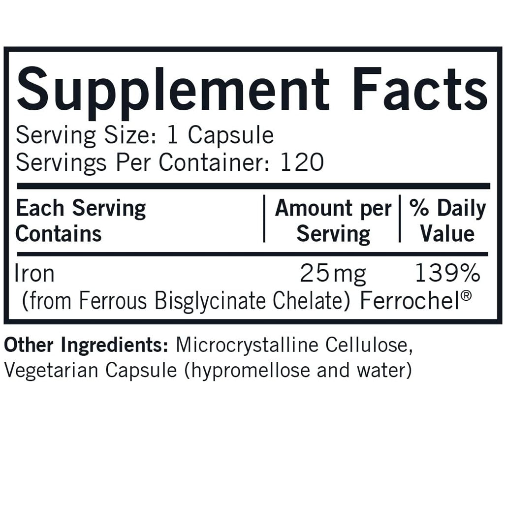This iron supplement contains 25 mg of iron (138% of recommended daily value). Aids in the production of hemoglobin and myoglobin and the formation of red blood cells and their oxygenation.* Gluten and casein free. Capsules are plant based. Ultra Tested®.