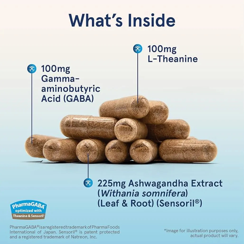 PharmaGABA® is GABA produced through natural fermentation by Lactobacillus hilgardii. Clinical studies show that PharmaGABA® can support alpha-waves and reduce stress-related beta-waves, thus helping to promote calmness while maintaining mental focus.* Theanine, found in green tea, supports relaxation without drowsiness and may support learning by affecting brain dopamine and serotonin.* Sensoril® ashwagandha extract is clinically studied to reduce fatigue, tension and exhaustion associated with everyday stress.*