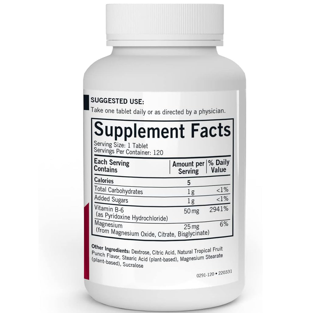 Provides a vitamin B-6 and magnesium supplementation in a tasty chewable wafer with natural fruit punch flavor. Free of common allergens. Gluten and casein free. Ultra Tested®.