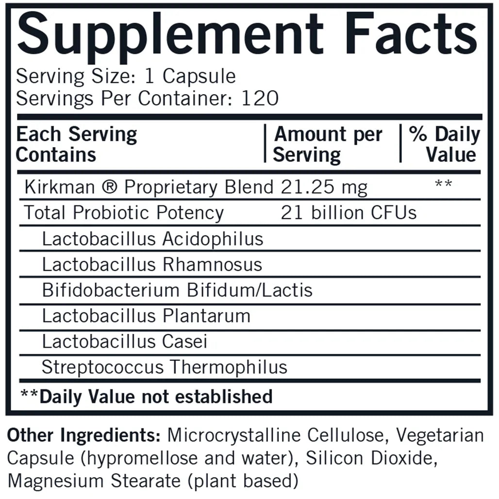 Kirkman’s most popular probiotic provides comprehensive digestion support.* Hypoallergenic. Gluten and casein free. 120 vegetarian capsules. Purity Tested®.