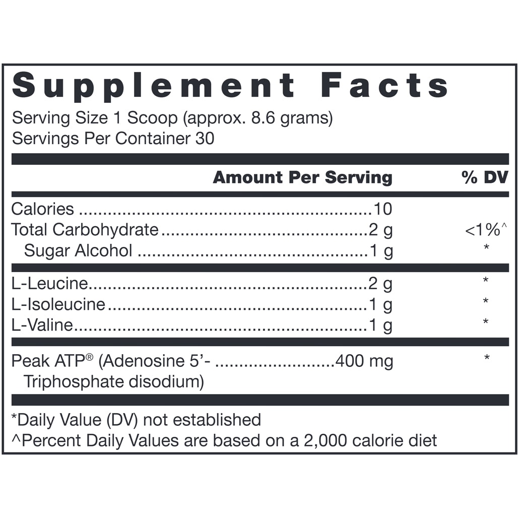 Klean BCAA + PEAK ATP® supplies a 2:1:1 ratio of the branched-chain amino acids leucine, isoleucine and valine, as well as 400 mg of ATP in each serving, to provide a direct source of energy to the muscles for performance and recovery.*