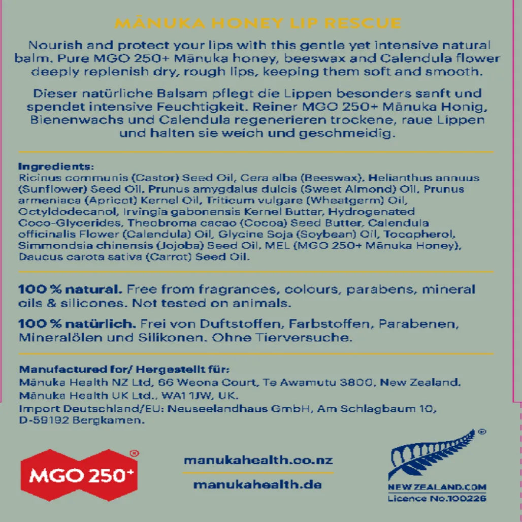 MGO 250+ Manuka Honey Lip Balm moisturizes, softens and protects dry, chapped lips with 100% natural ingredients.