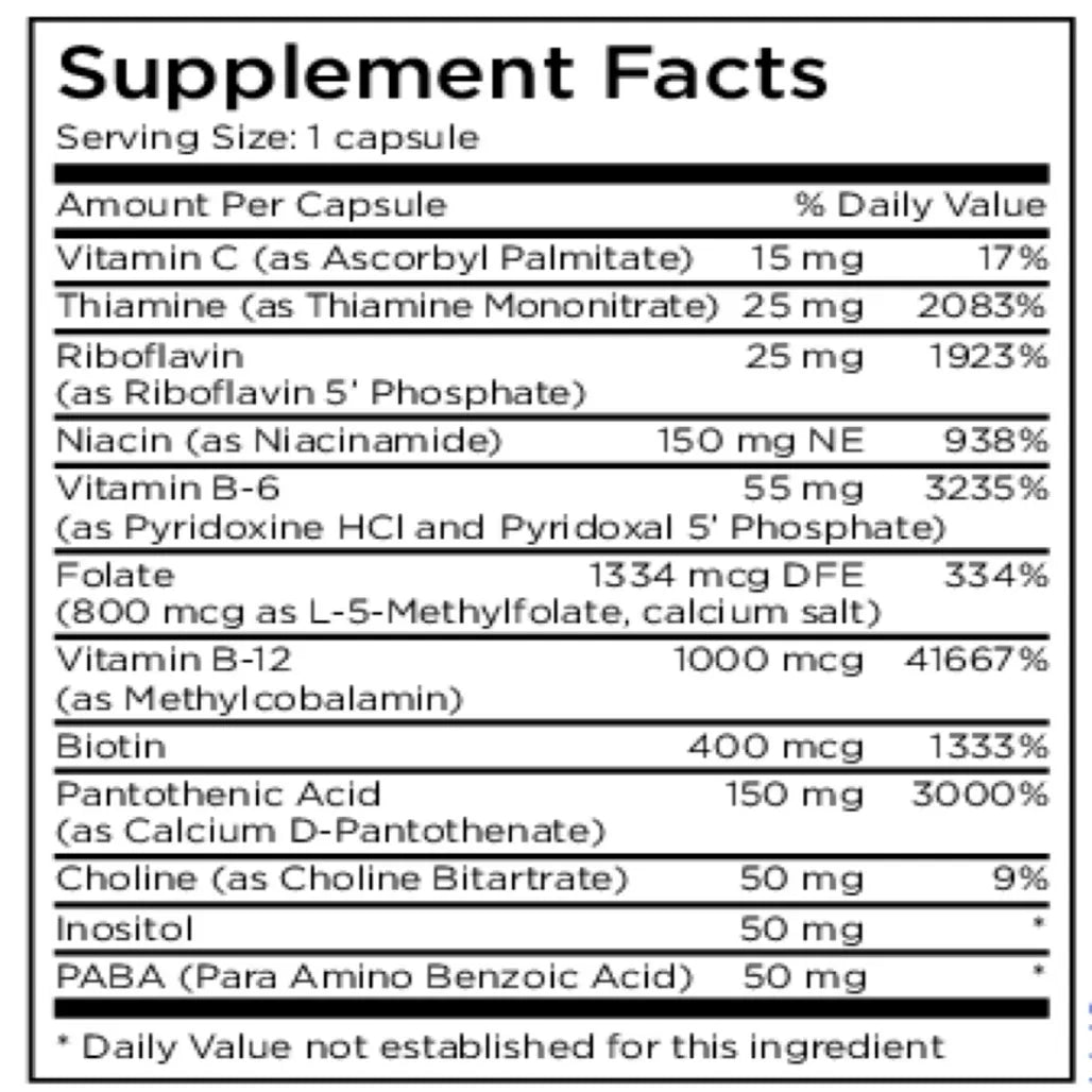 Our high potency B-Complex formula provides all eight essential B vitamins, plus choline, inositol, and PABA. Though each ingredient has unique roles in...