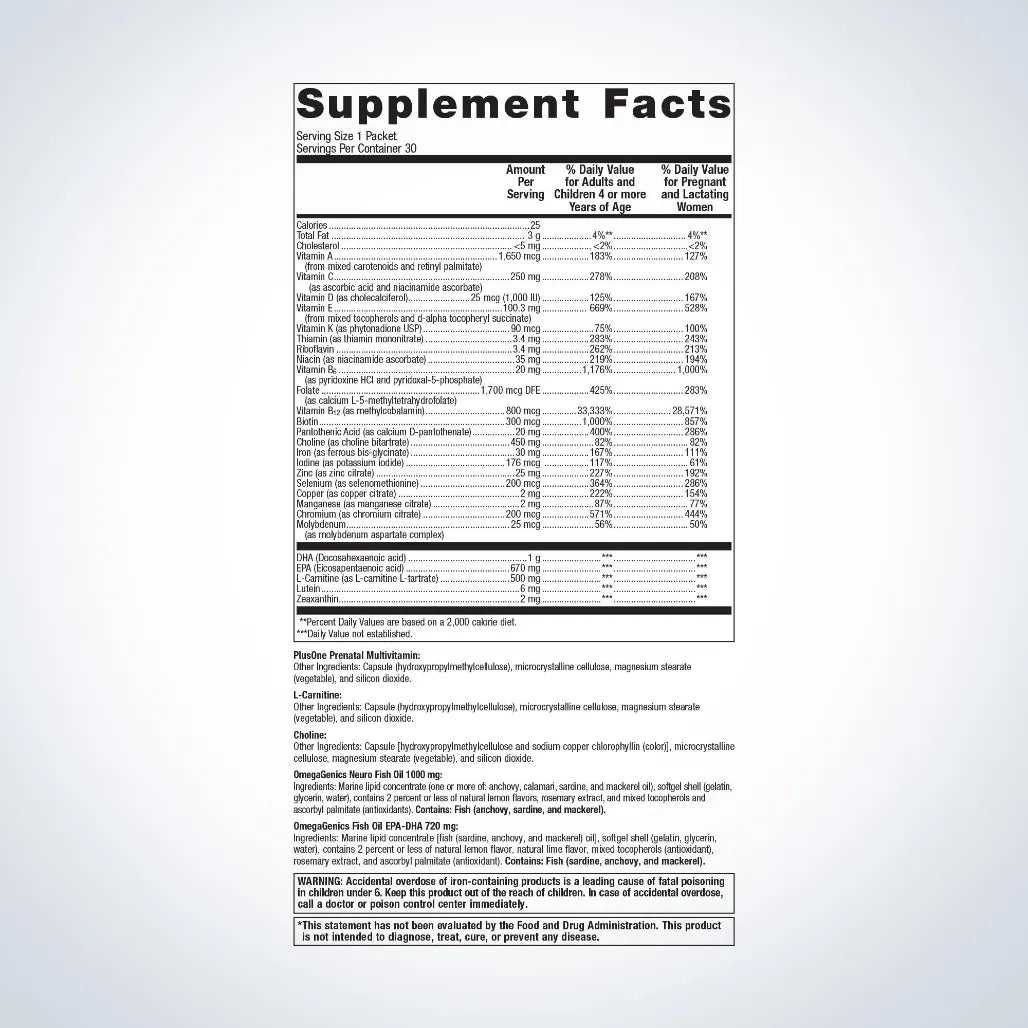 Each packet contains: 2 PlusOne Prenatal Multi capsules (light brown with speckles), 1 L-Carnitine capsule (white), 2 Choline capsules (green), 1 OmegaGenics EPA-DHA 720 softgel (yellow), and 1 OmegaGenics EPA-DHA Neuro 1000 softgel (yellow, etched)