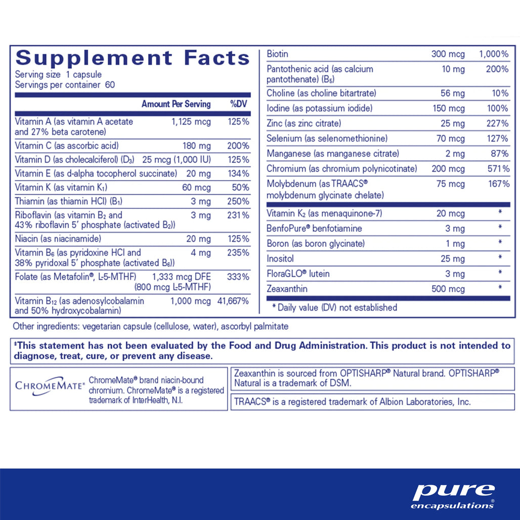 • Provides vitamins A, B, C, D, E and K in highly bioavailable forms • Includes activated B vitamins, including pyridoxal-5'-phosphate, riboflavin-5'-phosphate, enhanced-retention thiamin derivative benfotiamine and 800 mcg of Metafolin® L-5-methyltetrahydrofolate (L-5-MTHF), the naturally occurring, universally metabolized form of folate
