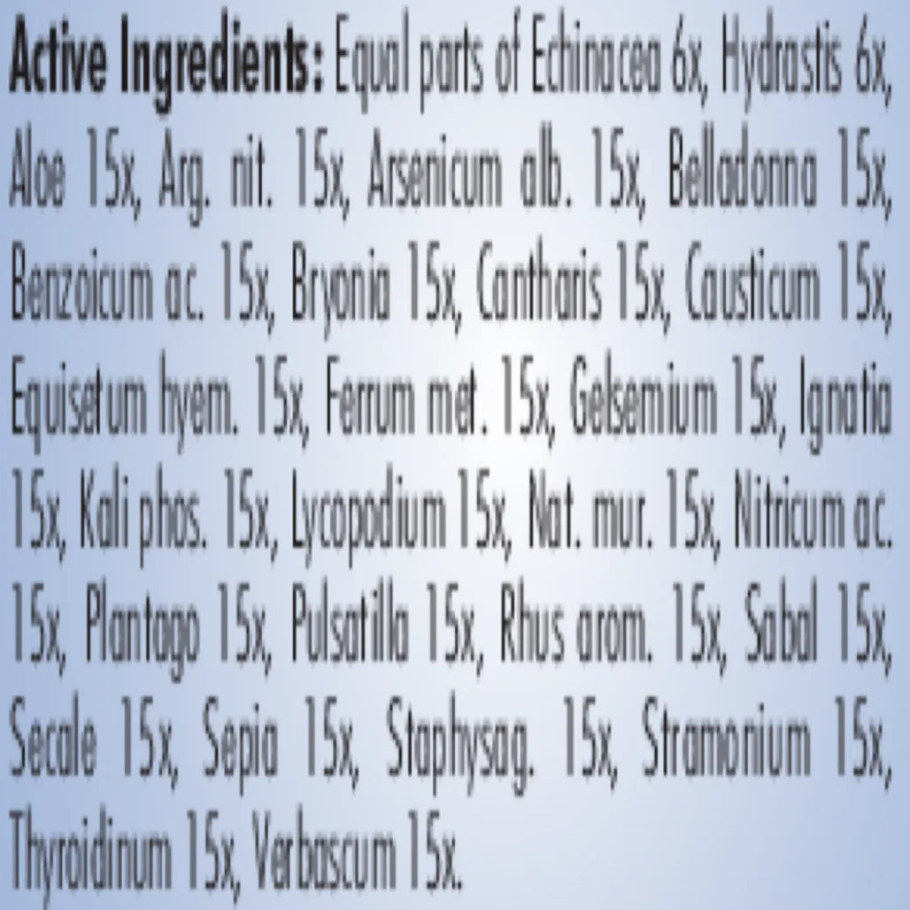 Homeopathic. Formulated for symptoms associated with various types of incontinence such as stress incontinence, urge incontinence and overflow incontinence.