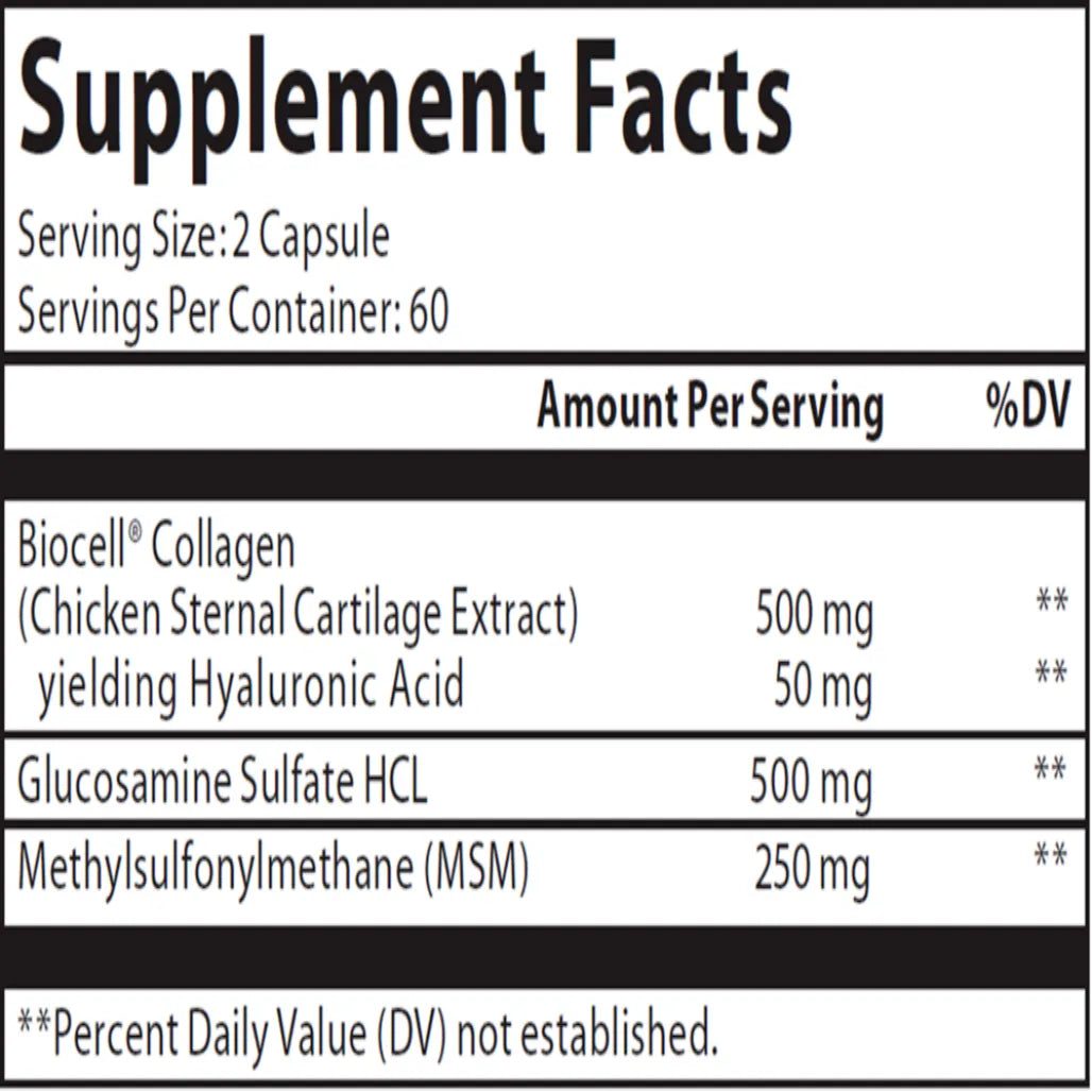 BioCell Type II Collagen Matrix consists of Collagen, Hyaluronic acid in a patented delivery system utilizing a low molecular weight H.A. (less than 30,000 daltons) for optimal utilization by the body and chondroitin sulfate. 60 mg of H.A. per serving.