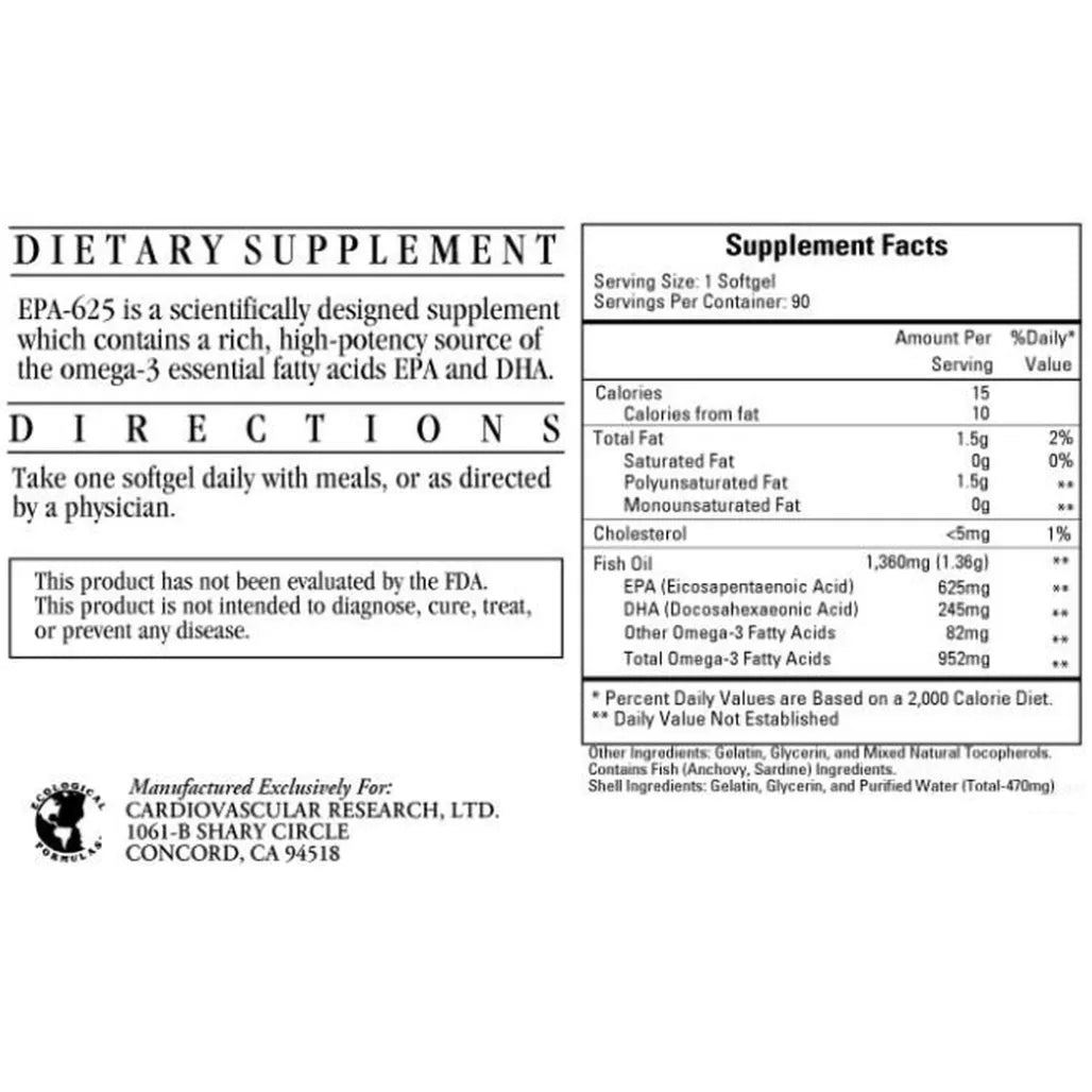 EPA-625 DHA-245 is available by Ecological Formulas/Cardiovascular Research.Cardiovascular Research Ltd.EPA-625 DHA-245 High Potency Omega-3Dietary SupplementMore Info: A DIETARY SUPPLEMENT EPA-625 is a scientifically designed supplement which contains a rich, high-potency source of the omega-3 essential fatty acids EPA and DHA.