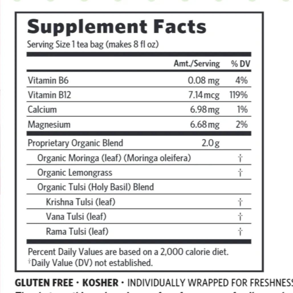 Incomparable Tulsi and powerful Moringa blend with Lemongrass to provide a natural energy boost for enhanced overall well-being.*