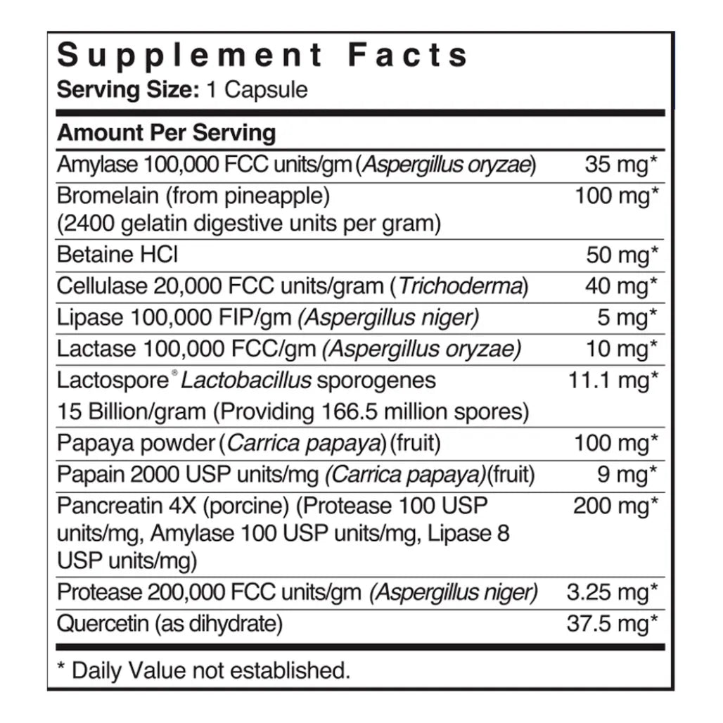 GI-One’s broad-spectrum digestive enzyme complex—including amylase, cellulase, lipase, lactase, pancreatin, protease, bromelain and papain—catalyzes breakdown of fats, carbohydrates and proteins, liberating energy while supporting absorption of health-promoting macronutrients.* The complete digestion of these macronutrients produces small peptides, amino acids, monosaccharides and disaccharides, and free fatty acids that can easily pass through the intestinal microvilli and enter the bloodstream.* Healthy digestion assures that incompletely digested molecules and proteins don’t enter the bloodstream where they can be recognized as foreign invaders by the immune system.*In addition, enzymes promote overall digestive comfort, helping with occasional gas and bloating as well as other concerns associated with gastrointestinal discomfort.*