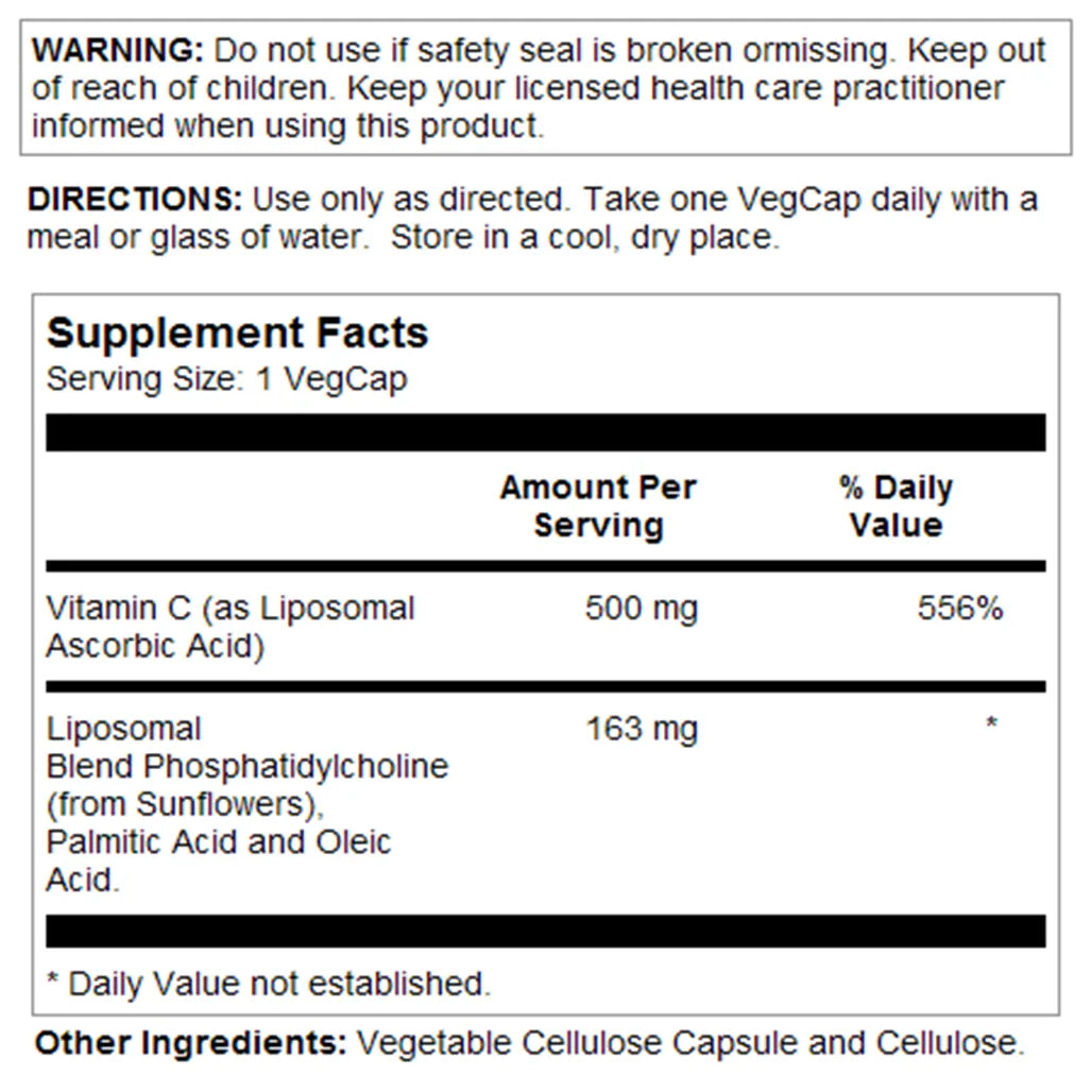 Solaray™ Liposomal Vitamin C vegetable capsules contain 400mg of fat soluble vitamin C. Liposomal C is created by combining vitamin C with fatty acids designed to provide antioxidant support to cell membranes and aid in the absorption of vitamin C.* Vitamin C provides antioxidant activity and is intended to help support normal, healthy collagen synthesis, capillary and blood vessel integrity, cartilage and bone development, immune function and nerve impulse transmission.*