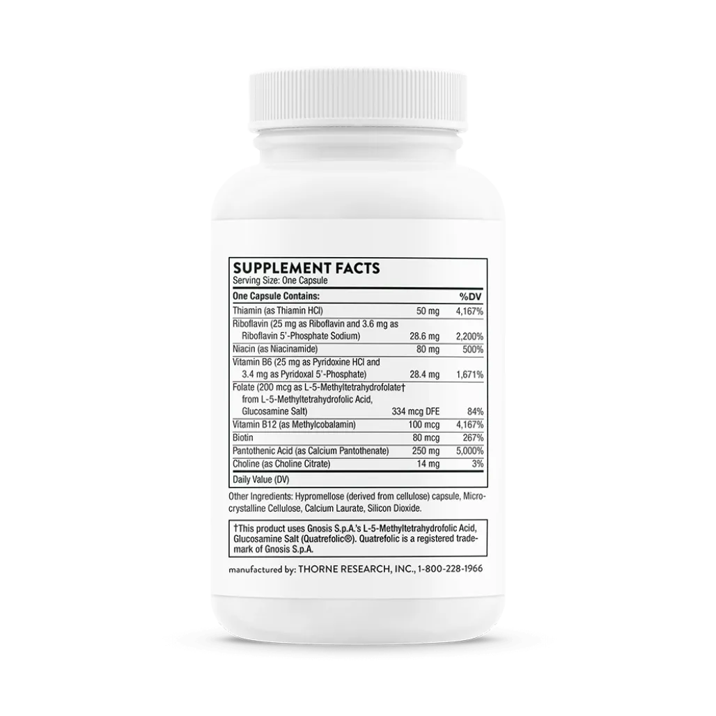 Stress B-Complex ByThorneStress B-Complex contains an optimal balance of essential B vitamins, with extra vitamin B5 to support healthy adrenal and immune function.* Healthy adrenal glands play an important role in effectively managing stress.* Pantothenic acid (vitamin B5) is part of the B-vitamin complex and is essential for healthy adrenal and immune function.*Thorne's Stress B-Complex provides extra vitamin B5, along with seven other water-soluble nutrients: thiamine (vitamin B1), riboflavin/R5P (vitamin B2), niacin (vitamin B3), pyridoxine/P5P (vitamin B6), methylcobalamin (vitamin B12), methyl-folate (5MTHF), and biotin. Although each B vitamin is chemically distinct, they work synergistically in various biochemical functions throughout the body – including cellular energy production, healthy red-blood-cell formation, and healthy neurological function.* Most B vitamins, with the exception of vitamin B12, are not stored in the body; consequently, they must be acquired daily from the diet in order to maintain optimal health.*