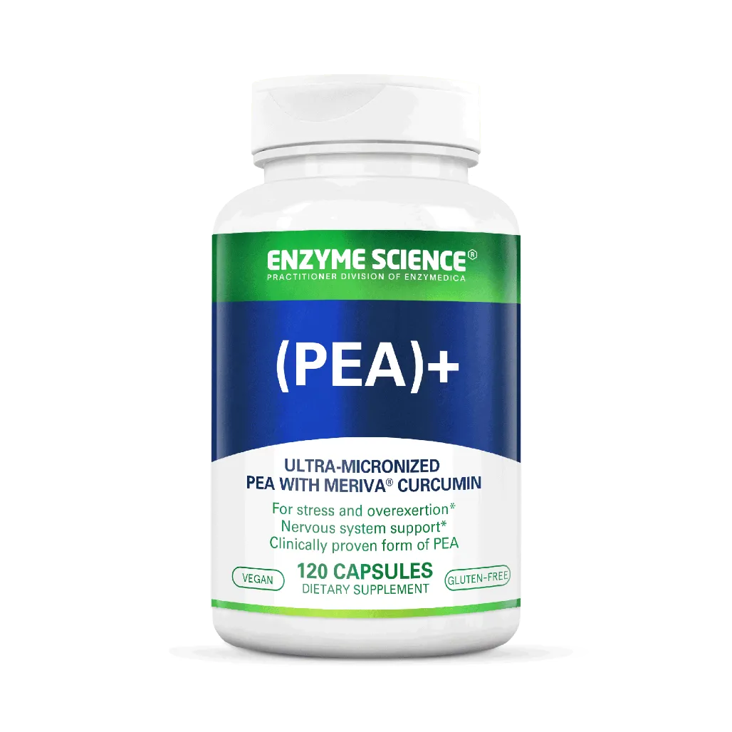 Now with ultra-micronized PEA, clinically proven to be a superior form.* Relieves stress, soreness and discomfort associated with occasional pain, stiffness, and compromised tissue function as a result of overexertion and everyday stress.*(PEA)+ ACHIEVING OPTIMAL HEALTH*In optimal health, the body's natural production of PEA is in homeostasis. This balance can sometimes be compromised due to negative stimuli. As a result, the response to this threat of imbalance can cause a deficiency in PEA production. Supplementation of PEA works with the body to support this delicate balance, calm discomfort, and promote levels of wellbeing.* In combination with Meriva Curcumin, this formula provides natural support for the entire body with a focus on the body's nervous, immune, and muscular systems.*PURE & NATURALEnzyme Science offers (PEA)+, a unique blend of PEA, from safflower seed, paired with the well-researched, patented, and highly bioavailable curcumin, Meriva® Phytosome.(PEA)+ only utilizes naturally derived palmitoyletha­nolamide from safflower seeds rather than the synthetic solvent alternatives that are commercially available. Since PEA is a lipid that has a large particle size in its unprocessed state, that can limit its solubility and bioavailability. However, ultra-micronized PEA has been processed using an air-jet milling technique. Ultra-micronized PEA offers greater absorption to support optimal nerve activity .*In addition, clinically studied Meriva® curcumin is highly bioavailable versus traditional forms for faster benefits.*