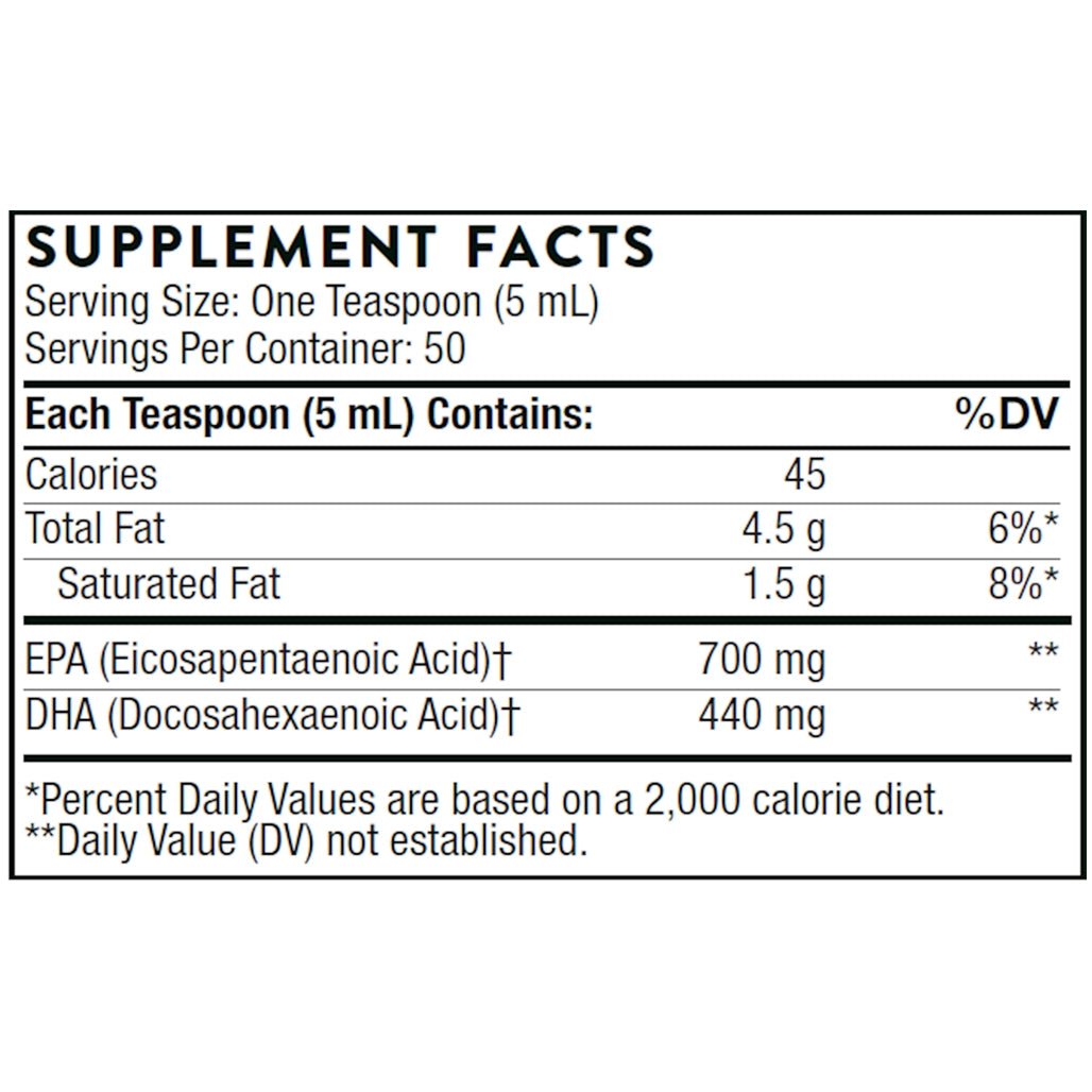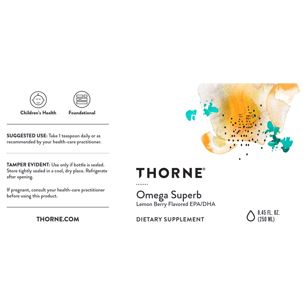 Omega Superb Lemon Berry Flavored EPA/DHA by Thornehelps maintain a healthy cytokine balance and supports heart, brain, nerve, skin, and eye health. Lightly sweetened lemon-berry flavor in a liquid for easy supplementation. Thorne's Omega Superb offers all the benefits of omega-3 fish oil in a great-tasting lemon-berry-flavored liquid that's easy to take for both adults and children.Omega Superb helps maintain the body's healthy inflammatory response, supports heart, brain, nerve, and eye health, and supports the health of cell membranes.The fish oil in Omega Superb undergoes molecular distillation to ensure the removal of cholesterol and contaminants, including PCBs and heavy metals.The EPA and DHA essential fatty acids in Omega Superb are in their naturally occurring triglyceride form. Omega Superb is lightly emulsified with sunflower-derived lecithin, which achieves a smooth, non-oily mouth feel.Added astaxanthin imparts a bright orange color and extra antioxidant support.* Lightly sweetened with monk fruit extract to enhance the fruit flavors, and naturally preserved with mixed tocopherols and rosemary.• Children’s Health• FoundationalServing Size:1 TeaspoonServings Per Container:50DisclaimerAmount Per Serving% Daily ValueCalories45Total Fat4.5 g6%Saturated Fat1.5 g8%EPA (Eicosapentaenoic Acid)†700 mgDHA (Docosahexaenoic Acid)†400 mgOmega Superb Lemon Berry Flavored EPA/DHA Ingredients:Flavors, Sunflower Lecithin, Mixed Tocopherols (non-GMO), Astaxanthin,Rosemary extract(Rosmarinos officinalis), Monk Fruit concentrate (fruit) (Siraitia grosvenorii), Ascorbyl Palmitate