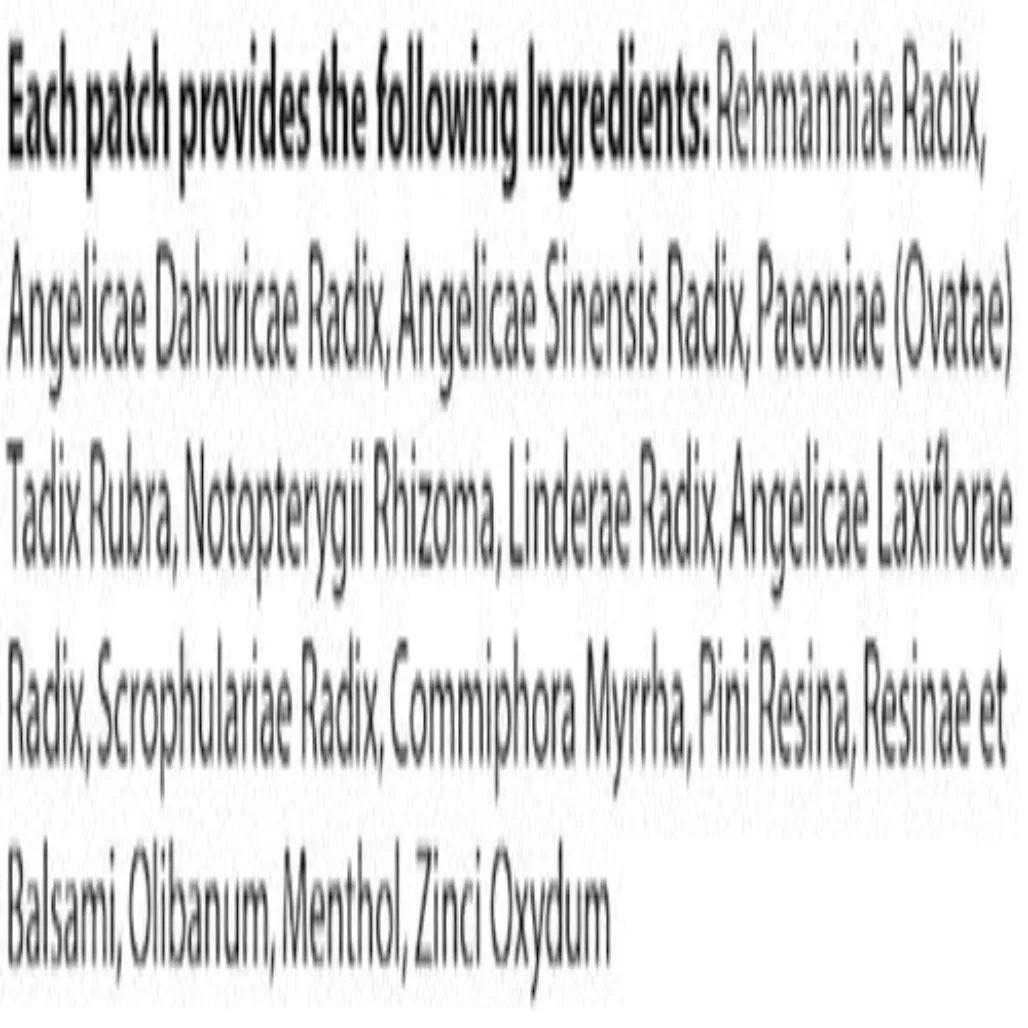 Each patch provides the following ingredients: Rehmanniae Radix, Angelicae Dahuricae Radix, Angelicae Sinensis Radix, Paeoniae (Ovatea) Tadix Rubra, Notopterygii ...