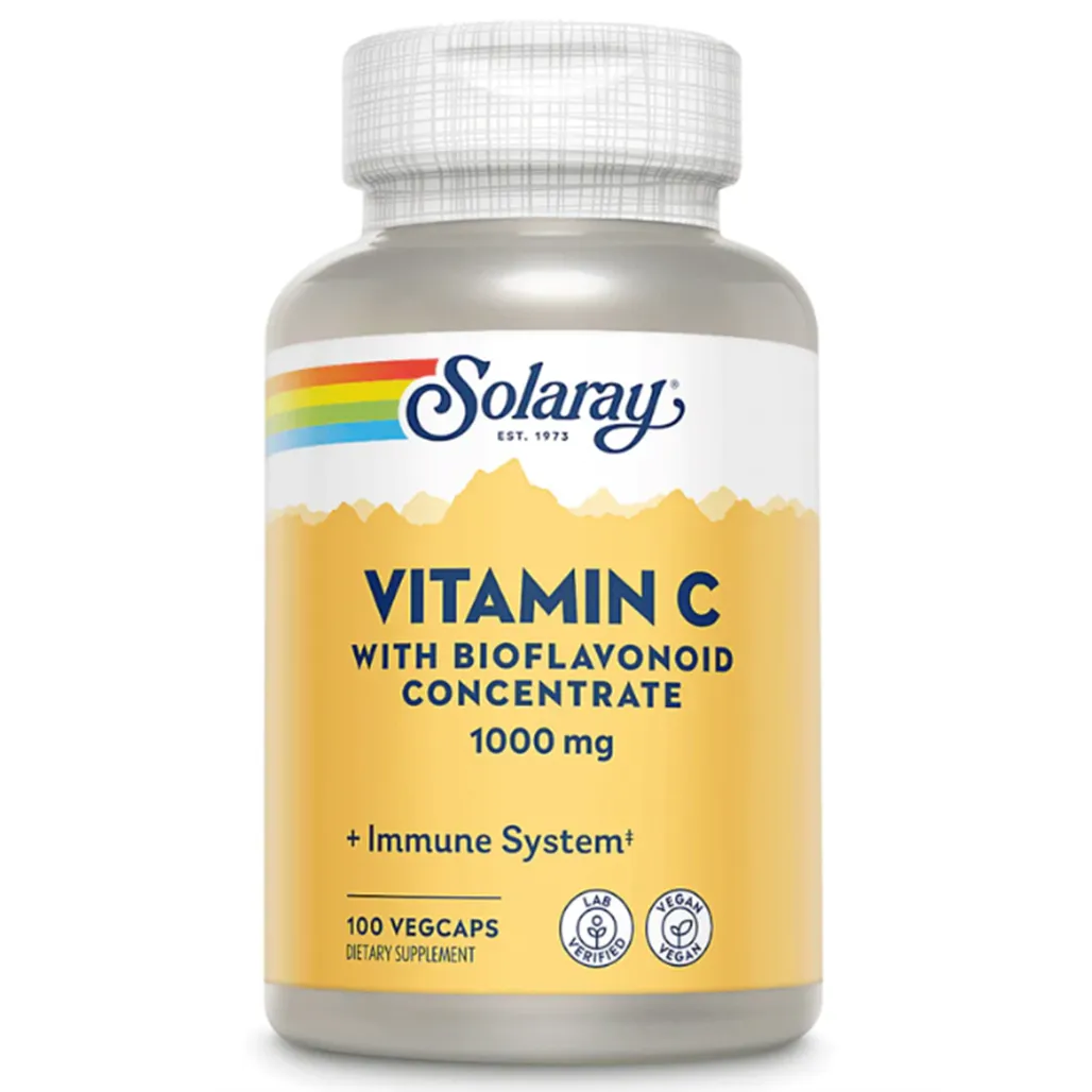 Solaray Vitamin C is formulated using a patent-pending, two-stage, timed-release concept. The vitamin C in Solaray Vitamin C is designed so that half is intended to be released immediately and the remaining vitamin C is intended to be gradually released over a 12 hour period. One capsule in the morning and another 12 hours later helps to extend the availability of vitamin C over a 24-hour period. Solaray Vitamin C provides antioxidant activity and is intended to provide nutritive support for normal, healthy collagen synthesis, cartilage and bone development, immune function, capillary and blood vessel integrity and nerve impulse transmission.*
