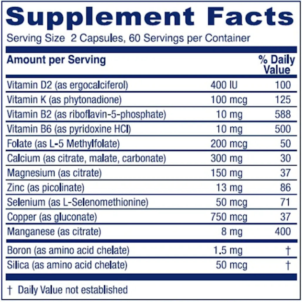 A holistic approach to supporting bone health and integrity with a full complement of supportive vitamins and minerals. Minerals and supporting cofactors are impor...