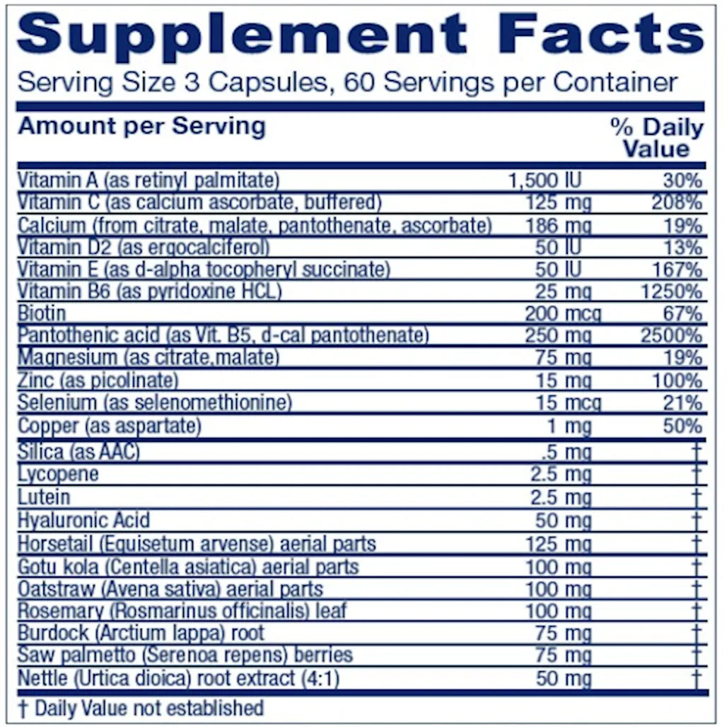 Serving Size:3 Vegetable CapsuleServings Per Container:60DisclaimerAmount Per ServingVitamin A (as retinyl palmitate)1500 IUVitamin C (as calcium ascorbate, buffered)125 mgCalcium (as citrate, malate)150 mgVitamin D2 (as ergocalciferol)50 IUVitamin E (as d-alpha tocopheryl succinate)50 IUVitamin B6 (as pyridoxine HCl)25 mgBiotin200 mcgPantothenic acid (as Vit. B5, d-cal panthenate)250 mgMagnesium (as citrate, malate)75 mgZinc (as picolinate)15 mgSelenium (as selenomethionine)15 mgCopper (as aspartate)1 mgSilica500 mcgL-Hydroxyproline (Lumistor™)100 mgHorsetail herb ~ Equisetum arvense125 mgGotu kola herb ~ Centella asiatica100 mgRosemary leaf ~ Rosmarinus officinalis100 mgOatstraw aerial parts ~ Avena sativa100 mgBurdock root ~ Articum lappa75 mgSaw palmetto berries ~ Serenoa repens75 mgNettles root ~ Urtica dioica50 mgOther Ingredients:vegetable capsule (vegetable cellulose and water), l-leucine