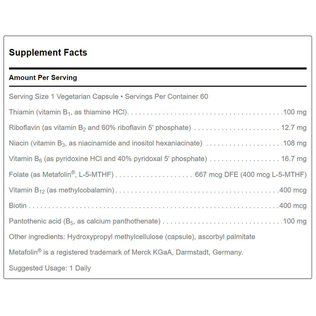 B-Complex is a combination of B vitamins, including vitamins B1, B2, B3, B5, B6, B12, biotin and folate (as Metafolin L-5-MTHF), all of which are provided in their optimal bioav...