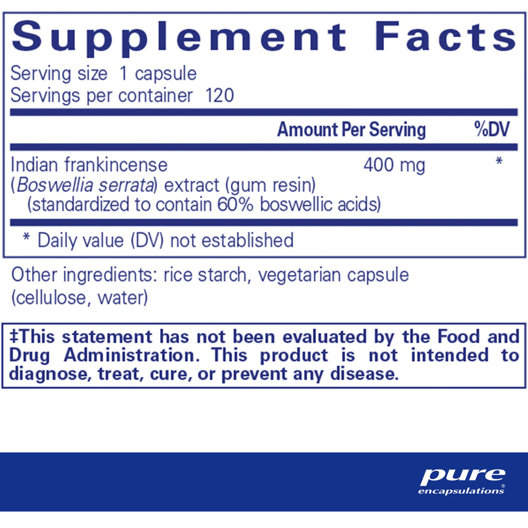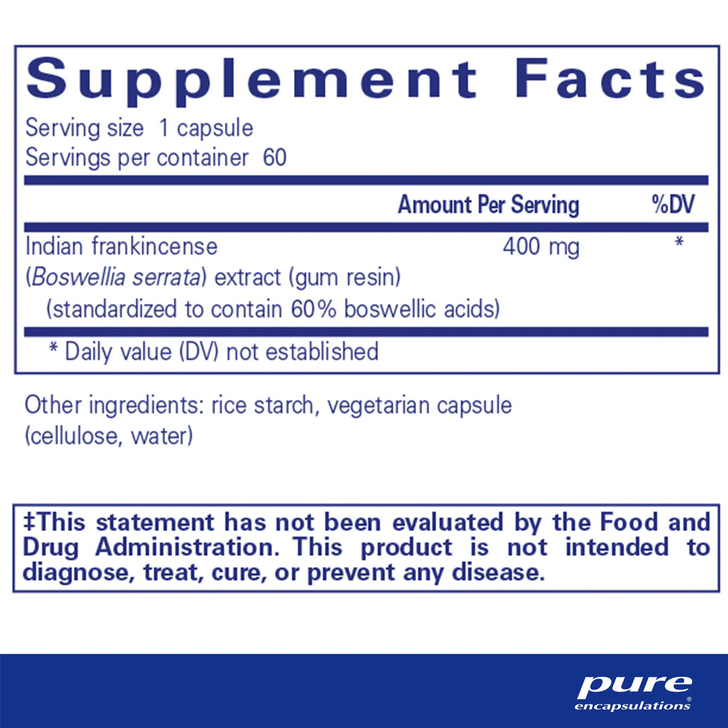 Pure Encapsulations Boswellia is a hypo-allergenic, herbal dietary supplement used for joint comfort, arthritis, and gastrointestinal and cellular health. Boswellia herbal extract is best known for supporting healthy connective tissue and joint function. With its deep penetrating properties, It can ease joint pain and stiffness and can be taken to support gastrointestinal health too.