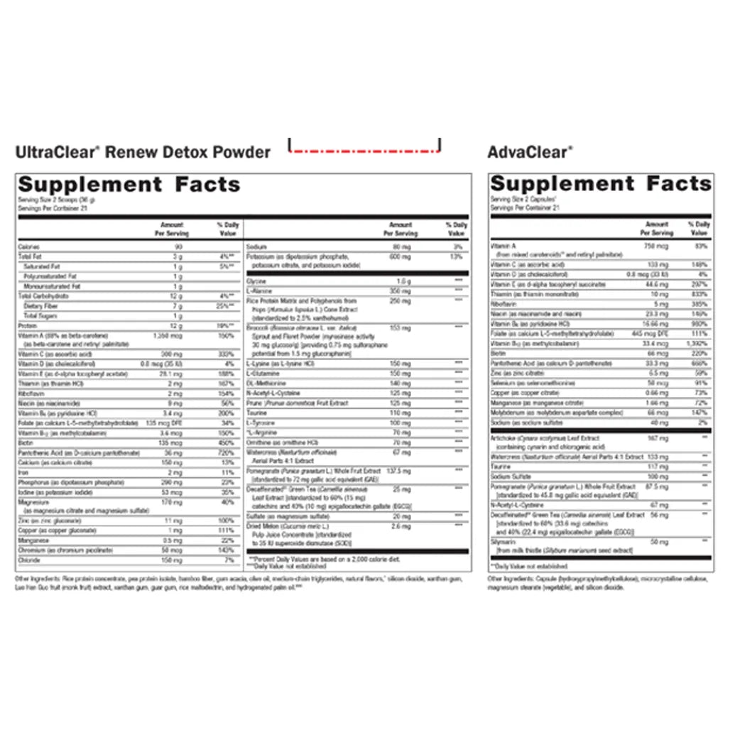 Ingredients:Rice protein concentrate, pea protein isolate, isomalto-oligosaccharide, apple fiber, organic cane sugar, L-glycine, magnesium citrate, natural flavors, dipotassium phosphate, olive oil, medium chain triglycerides, vitamin and mineral blend (ascorbic acid, zinc gluconate, rice malodextrin, d-alpha tocopheryl acetate, d-calcium pantothenate, beta-carotene, magnesium sulfate, D-biotin, niacinamide, copper gluconate, pyridoxine HCl, thiamin HCl, retinyl palmitate, riboflavin, potassium iodide, methylcobalamin, chromium picolinate, cholecalciferol, and calcium L-5-methyltetrahydrofolate), potassium citrate, calcium citrate, L-alanine, protein matrix and polyphenols from hops extract, L-lysine HCl, silica, xanthan gum, L-glutamine, broccoli sprout and floret powder, DL-methionine, pomegranate extract, N-acetyl-L-cysteine, prune skin extract, Luo Han Guo fruit (monk fruit) extract, guar gum, taurine, L-tyrosine, L-arginine, ornithine HCl, watercress aerial parts extract, decaffeinated green tea leaf extract, and melon pulp juice concentrate (hydrogenated palm oil‡‡ coated).AdvaClear®Supplement FactsServing Size 2 Capsules†Servings Per Container 21Amount Per Serving