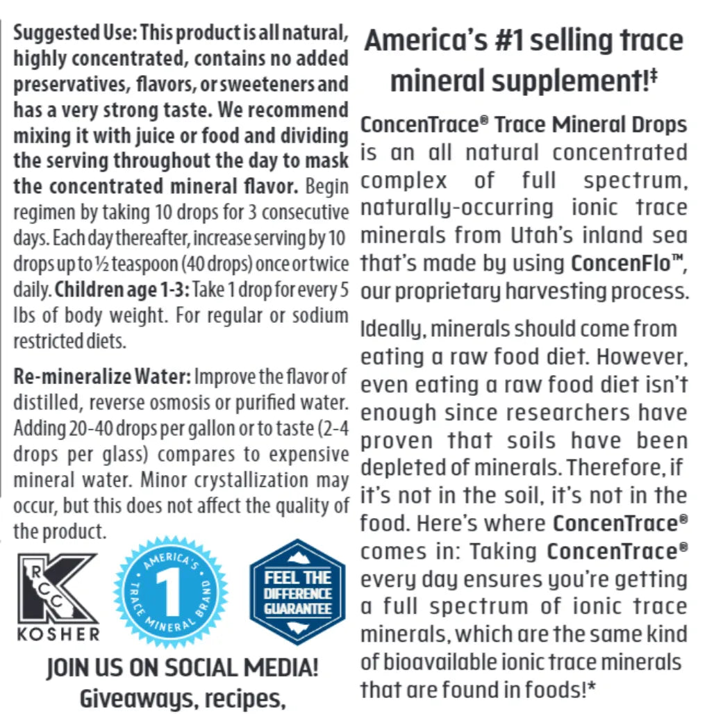 ConcenTrace® Trace Mineral Drops is an all natural mineral concentrate that’s made by using ConcenFlo™, Trace Minerals Research's proprietary harvesting process. ConcenTrace® contains naturally occurring ionic trace minerals from the Great Salt Lake with 99% sodium removed.