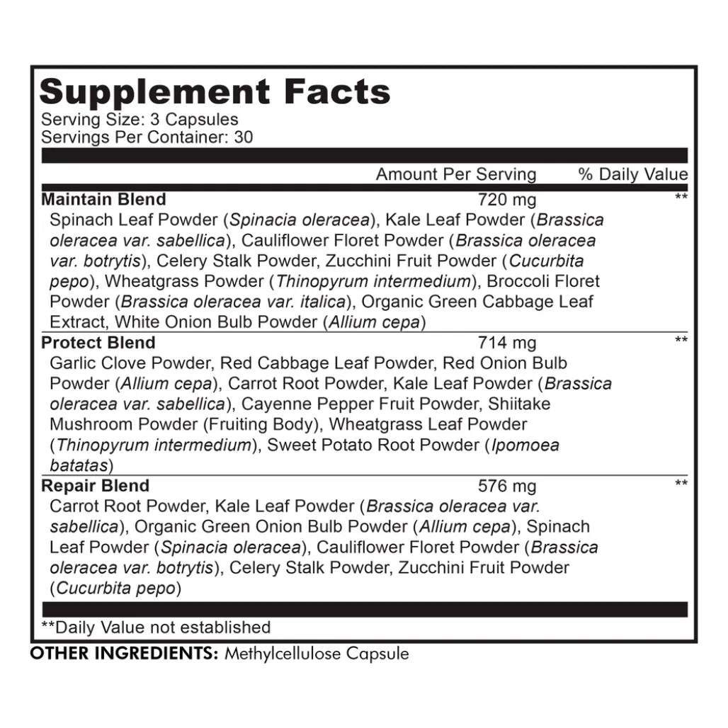 Greens On-The-Go. Instantfood Easy Veggies combines 15+ vegetable extracts in daily capsules, offering a diverse source of vitamins, fibers, and minerals. This veggies supplement combines leafy greens, dark green vegetables, and starchy and non-starchy vegetables whole-food extracts all-in-one. • Instantfood Easy Veggies supplement features over 15 vegetable extracts, including broccoli, spinach, organic green cabbage, wheatgrass, kale, cauliflower, carrot, celery, tomato, carrot, zucchini, cauliflower, brussels sprout, shiitake mushroom, and more, offering a diverse range of nutrients. • This veggies supplement formula combines leafy greens, dark green vegetables, and starchy and non-starchy vegetables with whole-food extracts, offering a well-rounded and comprehensive nutritional profile to help support your daily needs. • Instantfood Easy Veggies is vegan, non-GMO, dairy-free, soy-free, gluten-free, wheat-free, and yeast-free, with no artificial flavors, colors, sweeteners, or preservatives, ensuring a clean and pure formula. This vegetable supplement is also free from common allergens and artificial ingredients. • Convenient daily capsules make it easy to incorporate Instantfood Easy Veggies' nutrient benefits into your routine. Each bottle of Instantfood green vitamins comes with 1 month of supply. • Instantfood Easy Veggies is manufactured in the USA in a cGMP-certified facility for the quality and purity of this plant-based, nutrient-dense supplement. This veggies formula can be paired with Instantfood Fast Fruits or the Easy Veggies + Fast Fruits Bundle for even more comprehensive supplementation. Part or all the ingredients provided in this green superfood formula can be received in adequate or extra amounts from nutrient-dense foods and a regular well-balanced diet alone that includes a variety of other whole foods. Individual results may vary and depend on a lot of factors including age, health conditions, diet, genetic markup, lifestyle, physical activity, and regular exercise.