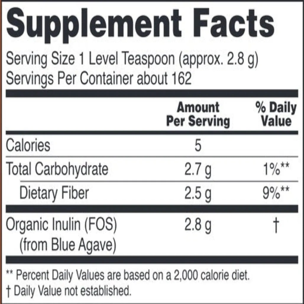 Inulin, a fructooligosaccharide (FOS), is a soluble prebiotic fiber that is resistant to digestion and reaches the large intestine essentially intact.* Intestinal probiotic bacteria consume Inulin and in turn, produce the short-chain fatty acids that nourish the cells lining the colon.* Inulin thus helps to maintain intestinal health and function.* Inulin has a pleasant flavor that adds a mild sweetness to foods and drinks, but has a very low glycemic index and will not negatively impact serum glucose levels.*