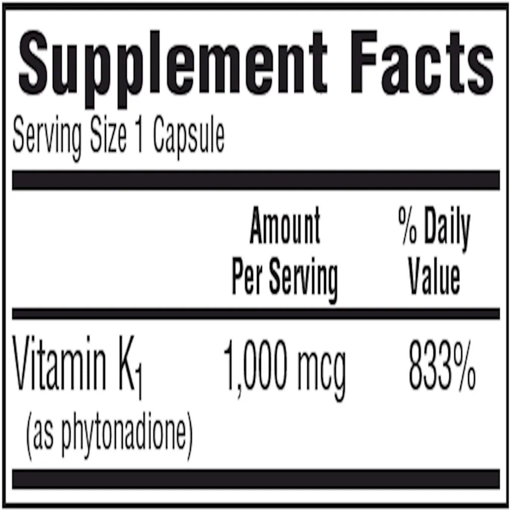 • Vitamin K refers to a group of similar compounds that vary in their absorption, metabolism, and tissue distribution.These essential nutrients work together with vitamin D to direct calcium deposits to bones instead of soft tissues, providing support for both skeletal and cardiovascular health.* • Vitamin K also activates proteins involved in normal blood coagulation and clot formation .* • Vitamin K1 is found naturally in green leafy vegetables and many other healthy foods. K1-1000 is formulated with a dry preparation of vitamin K1.Health Benefits: • Supports bone and cardiovascular health* • Directs calcium deposits to bones instead of soft tissues* • An excellent complement to calcium and vitamin D supplements for optimal bone health* • Formulated with a dry preparation of vitamin K1