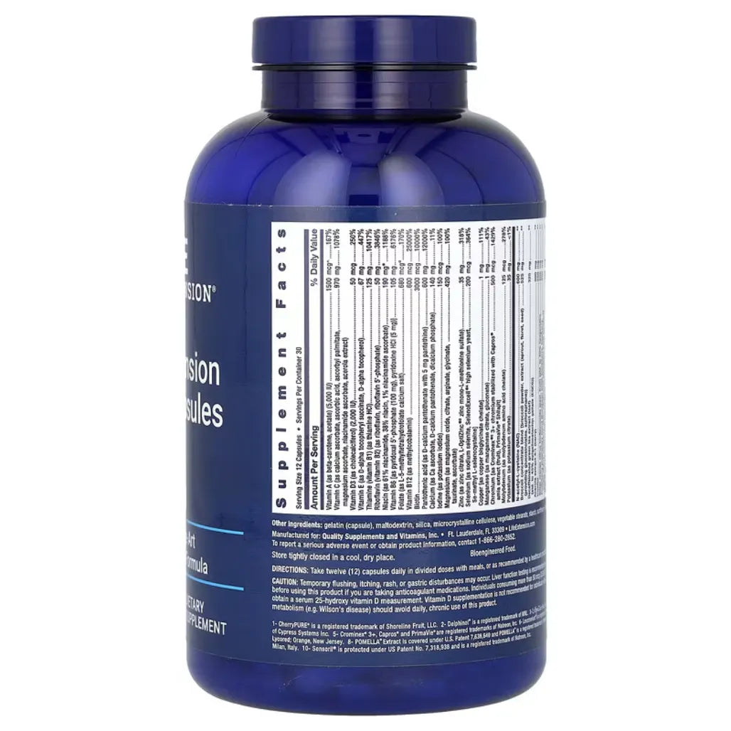Vitamin A (as beta-carotene, acetate) (5,000 IU)1500 mcg167%Vitamin A (as beta-carotene, acetate) (5,000 IU)Vitamin C (as calcium ascorbate, ascorbic acid, ascorbyl palmitate magnesium ascorbate, niacinamide ascorbate, acerola extract)970 mg1078%Vitamin D3 (as cholecalciferol) (2,000 IU)50 mcg250%Vitamin E (as D-alpha tocopheryl succinate, D-alpha tocopherol)67 mg447%Thiamine (vitamin B1) (as thiamine HCl)125 mg10417%Riboflavin (vitamin B2) (as riboflavin, riboflavin 5’-phosphate)50 mg3846%Niacin (as 61% niacinamide, 38% niacin, 1% niacinamide ascorbate)190 mg1188%Vitamin B6 [as pyridoxal 5’-phosphate (100 mg), pyridoxine HCl (5 mg)]105 mg6176%Vitamin B6 [as pyridoxal 5’-phosphate (100 mg), pyridoxine HCl (5 mg)]Folate (as L-5-methyltetrahydrofolate calcium salt)400 mcg100%Vitamin B12 (as methylcobalamin)600 mcg25000%Biotin3000 mcg10000%Pantothenic acid (as D-calcium pantothenate with 5 mg pantethine)600 mg12000%Calcium (as Ca ascorbate, D-calcium pantothenate, Ca D-glucarate, dicalcium phosphate)140 mg11%Iodine (as potassium iodide)150 mcg100%Magnesium (as magnesium oxide, citrate, arginate, glycinate, taurinate, ascorbate)420 mg100%Zinc (as zinc citrate, L-OptiZinc ®3 zinc mono-L-methionine sulfate)35 mg318%Selenium [as sodium selenite, SelenoExcell ®4 high selenium yeast Se-methyl L-selenocysteine]200 mcg364%Copper (as TRAACS ®13copper bisglycinate chelate)1 mg111%Manganese (as manganese citrate, gluconate)1 mg43%Chromium [as Crominex ®5 3+ chromium stabilized with Capros ® amla extract (fruit), PrimaVie ® Shilajit]500 mcg1429%Molybdenum (asmolybdenum amino acid chelate)125Potassium (as potassium citrate)35 mg1%Broccoli concentrate blend:broccoli powder, extract (sprout, floret, seed)725 mgglucosinolatessulforaphanecalcium D-glucarateN-acetyl-L-cysteine (NAC)600 mgDecaffeinated green tea extract (leaf ) [std. to 45% epigallocatechin gallate (EGCG)]325 mgAcerola extract 4:1 (berry)300 mgInositol250 mgBitter orange citrus bioflavonoids (peel, fruit ) [std. to 50% hesperidin]200 mgFruit/berry proprietary blend:200 mgEuropean elderblackberryblueberrysweet cherrycranberryplumpersimmon (Diospyros kaki )Taurine200 mgWild blueberry anthocyanin extract (fruit)150 mgSensoril®12 Ashwagandha extract (root,leaf ) [std. to 32% oligosaccharides 10% glycoside conjugates]125 mgSilymarin [from milk thistle extract (seed)100 mgTrimethylglycine (TMG) (as betaine anhydrous)100 mgCherryPure ®1 sour cherry (tart cherry) proanthocyanidin powder (skin)85 mgPOMELLA ® 9 pomegranate extract (fruit ) [std. to 30% punicalagins]85 mgNatural mixed tocopherols (providing gamma, delta, alpha, beta tocopherols)60 mgMirtoSelect ®11 bilberry extract (fruit)30 mgBioVin ®7 grape proanthocyanidin extract (whole grape)25 mgLeucoselect ®6 grape seed proanthocyanidin extract25 mgBromelain [from pineapple (stem)] (2400 gelatin digestive units/gram)15 mgLutein [from marigold extract (flower) (providing 465 mcg trans-zeaxanthin)15 mgOlive extract (fruit) (providing polyphenols, hydroxytyrosol, tyrosol, oleuropein)12.5 mgSesame seed lignan extract10 mgLuteolin [from orange extract (fruit)]8 mgApigenin5 mgBoron (as boron amino acid chelate)3 mgLycopene [from LycoBeads ®8 natural tomato extract (fruit)]3 mgDelphinidins [from Delphinol ®2 maqui berry (Aristotelia chilensis ) extract (fruit)]2 mgCyanidin-3-glucoside (C3G) [from black currant extract (fruit)]1.25 mgTrans-pterostilbene (from pTeroPure ®10 )0.5 mgOther Ingredients:gelatin (capsule), maltodextrin, vegetable stearate, silica, microcrystalline cellulose, starch