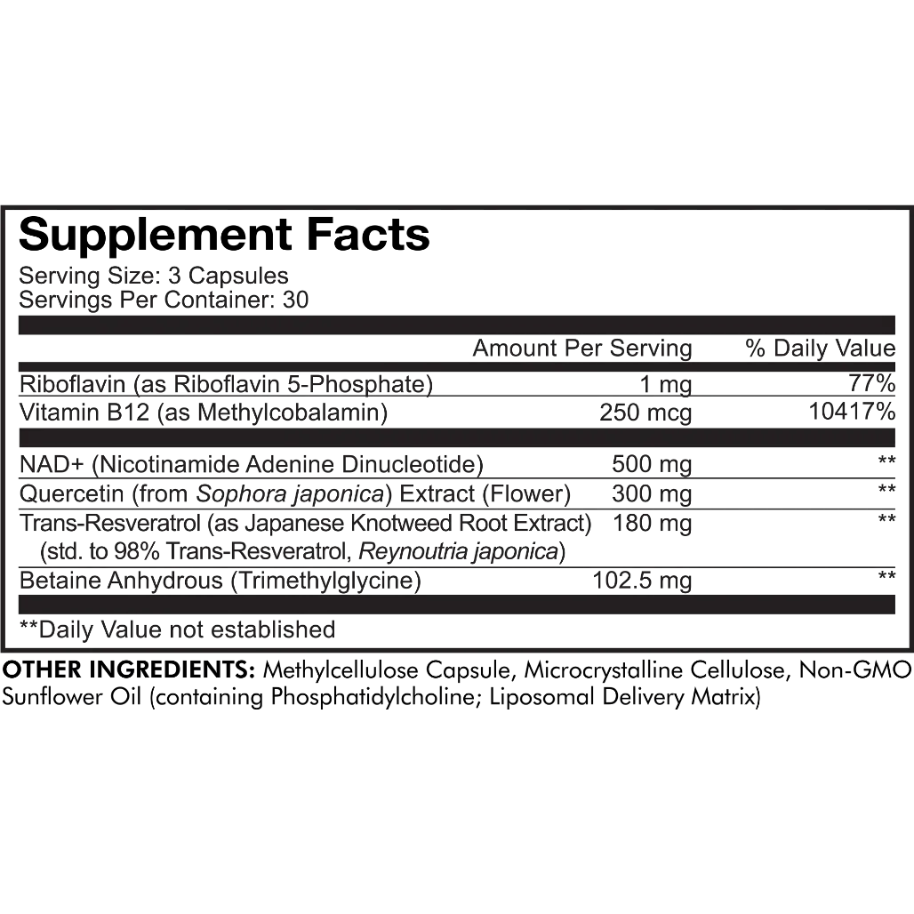 Codeage Liposomal NAD+ ULTRA supplement capsules feature a comprehensive blend of key ingredients, including NAD+ (Nicotinamide Adenine Dinucleotide), quercetin, resveratrol, b...