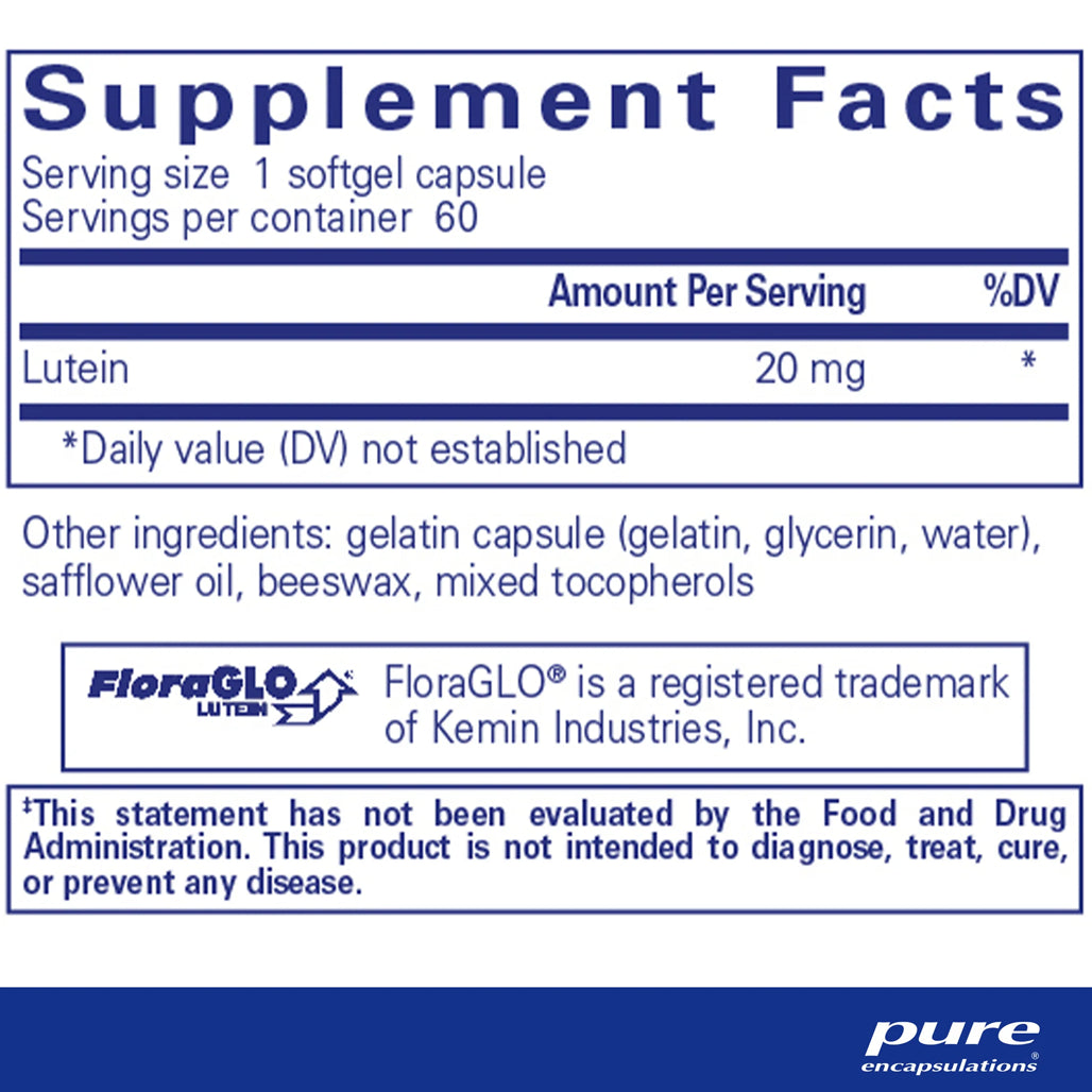 Lutein is a carotenoid found in a vast number of fruits and vegetables. Pure Encapsulations' free-form Lutein is structurally identical to the lutein found naturally in spinach and other leafy greens. Like other carotenoids, lutein has antioxidant activity in various tissues but is one of only two that are stored within the retina, where lutein promotes the integrity and density of the macular pigment, a key component of ocular health. Multiple clinical studies suggest a direct relationship between lutein supplementation and macula lutein concentration. Lutein uptake reportedly occurs in the receptor layer of the eye through a soluble carotenoid-binding protein called tubulin.