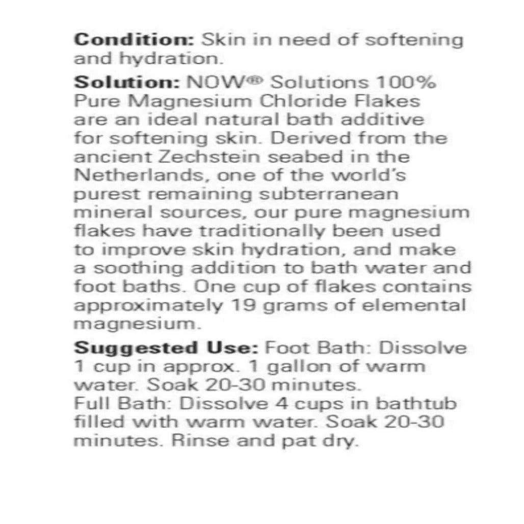 Solution: NOW® Solutions 100% Pure Magnesium Chloride Flakes are an ideal natural bath additive for softening skin....